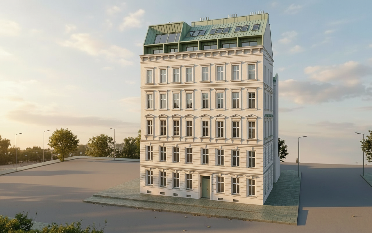 insert neighbouring buildings in succession left and right the buildings should be different in colours and both in turn of the century house style in vienna