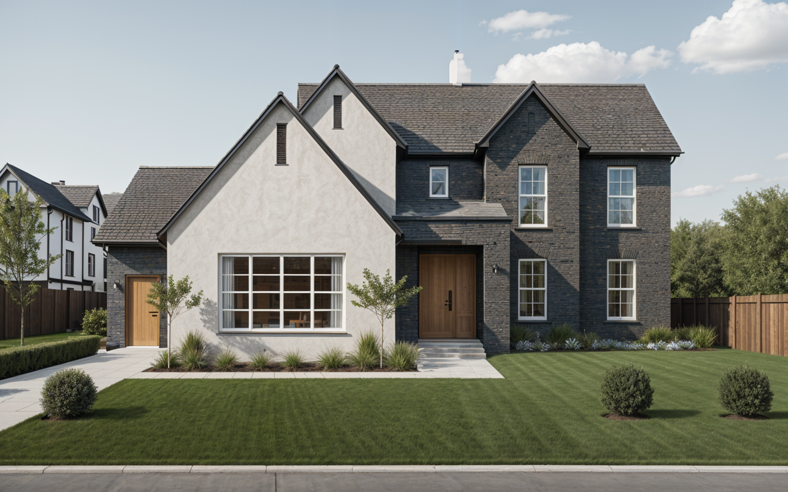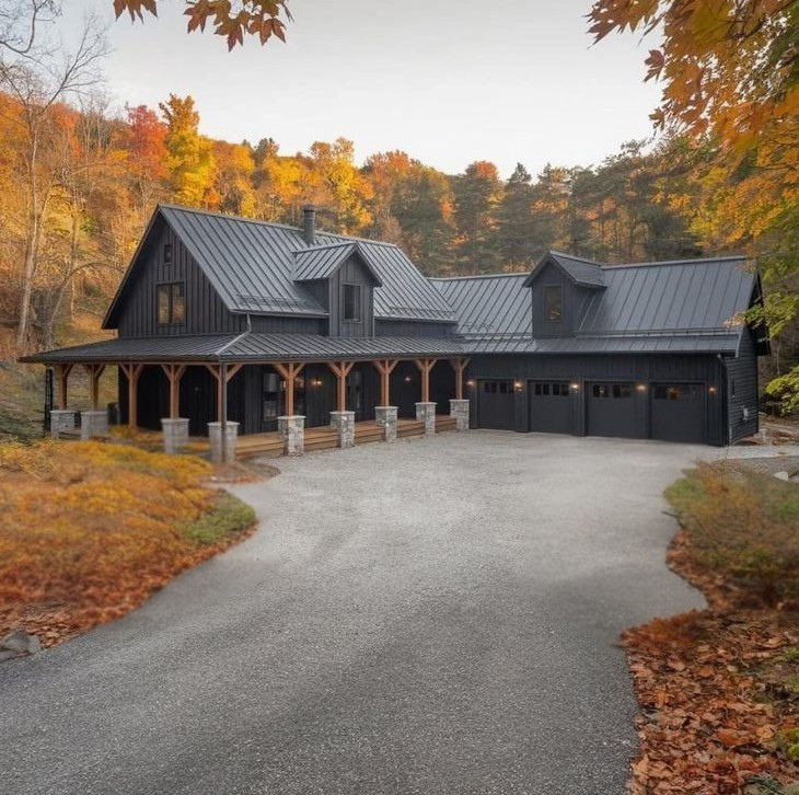 modernist exterior shot render a modern farmhouse with a rustic charm the house features a black metal roof white vertical siding and warm stone accents large black framed windows create an inviting glow from the warm indoor lighting the expansive green lawn is lush and meticulously maintained capture a serene atmosphere with a bright clear sky and soft evening light enhancing the textures and colors of the materials architecture