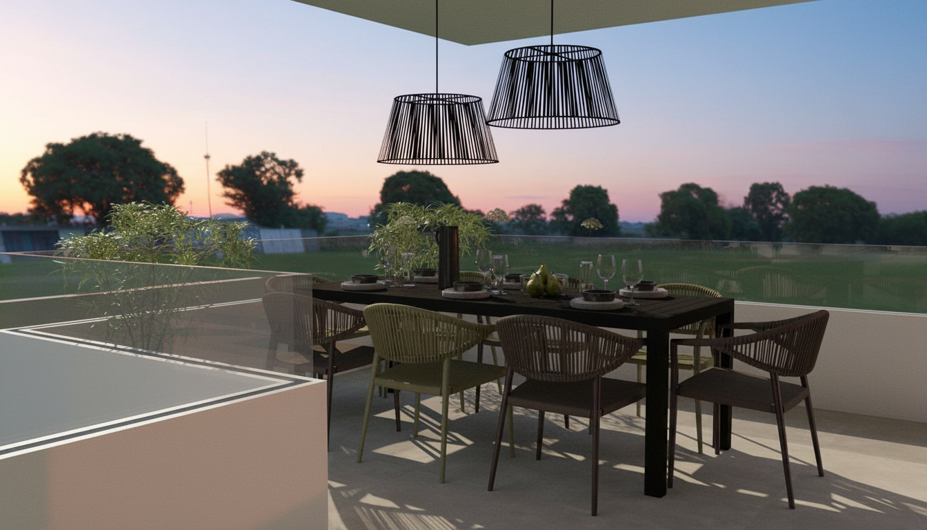 model of a villa add few trees in background to give it context add few very neatly organized vegetation with few floral ones