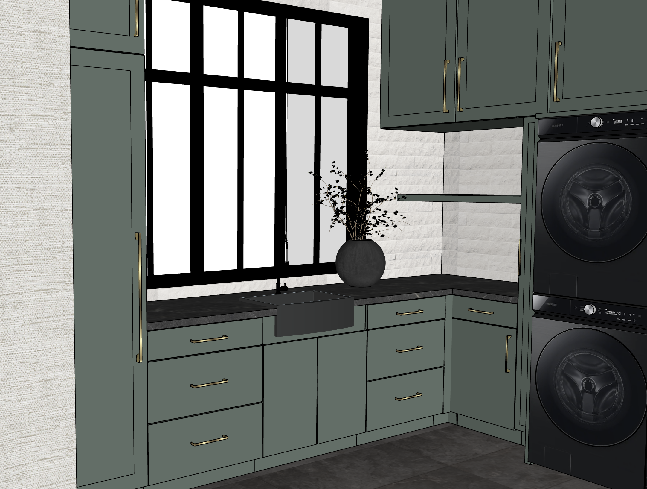 olive green cabinets with gold hardware lighting on open shelving windows look out to driveway and landscaped front yard left wall is a grass cloth wallpaper time of day is morning less light coming in windows brighten room more to see more of green cabinets back wall is textured stone