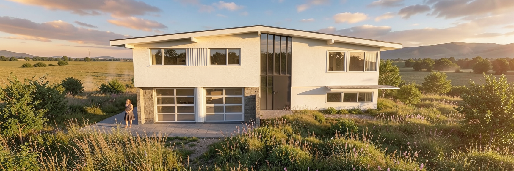 modern warm residential loft kitchen polished concrete floors white walls and white concrete ceilings are painted smooth creamy white like the paint chip in the photo 2x6 glossy beige zellige tile backsplash vertically stacked floating shelves on backsplash wall are light oak kitchen cabinets are a neutral light tan laminate white marble countertops on back kitchen counter base of island counter in foreground painted off white dark grey granite countertop on island off white colored pendants use a combination of soft interior lighting and exterior golden hour daylight do not change any building geometry do not change or add any architectural elements do not change windows or doors keep camera view and angle the same do not add any decor not shown in reference image window above tiled wall has painted white metal frame and mullions