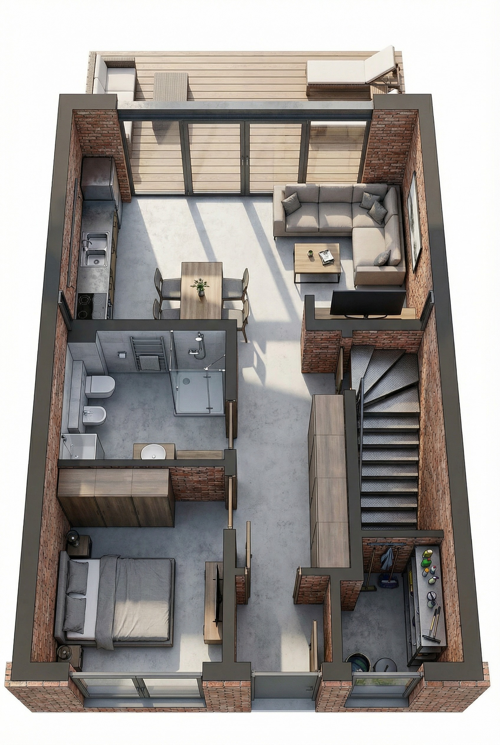 convert this floor plan into a realistic isometric 3d view of a full house show the space from an elevated angle with furniture walls and details visible use the same furniture as shows on the plan do not change the orientation of the floorplan