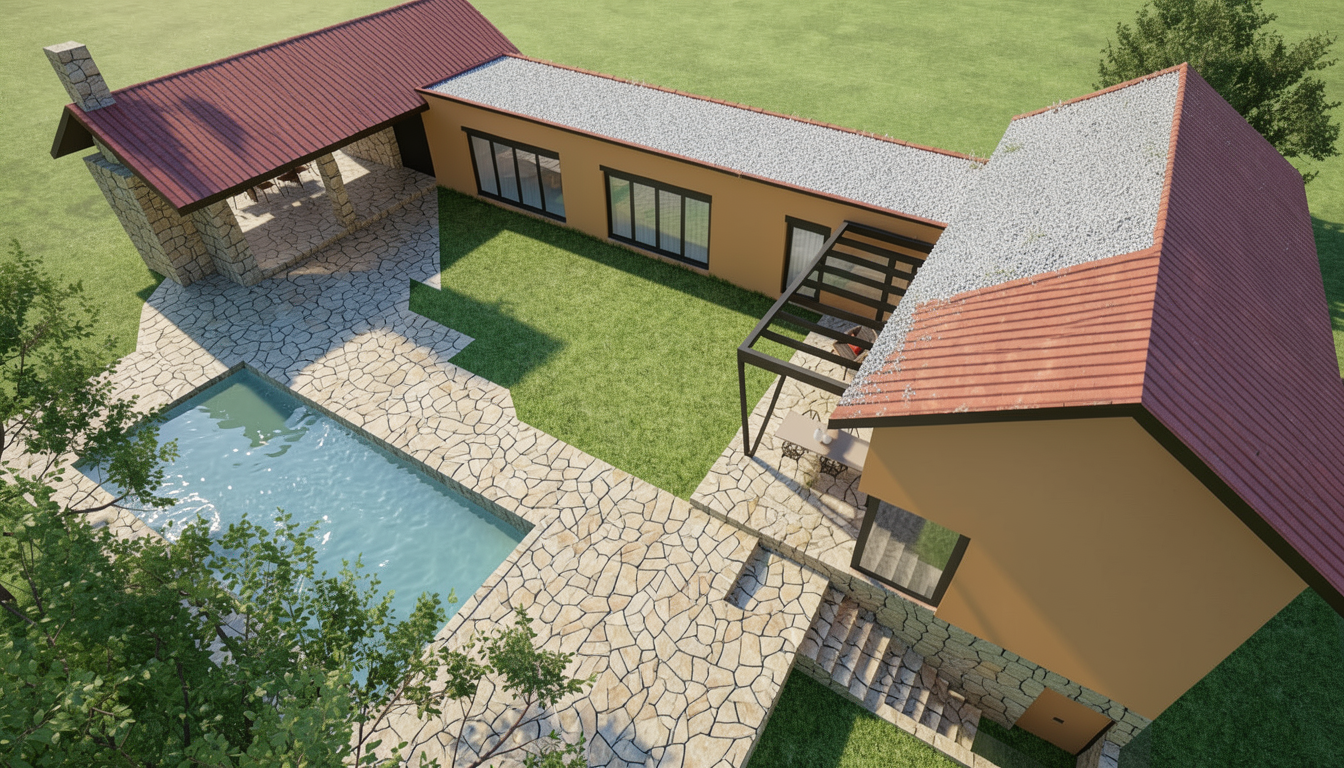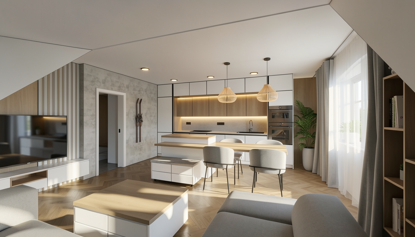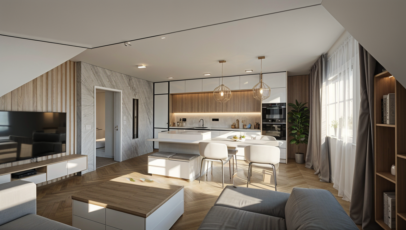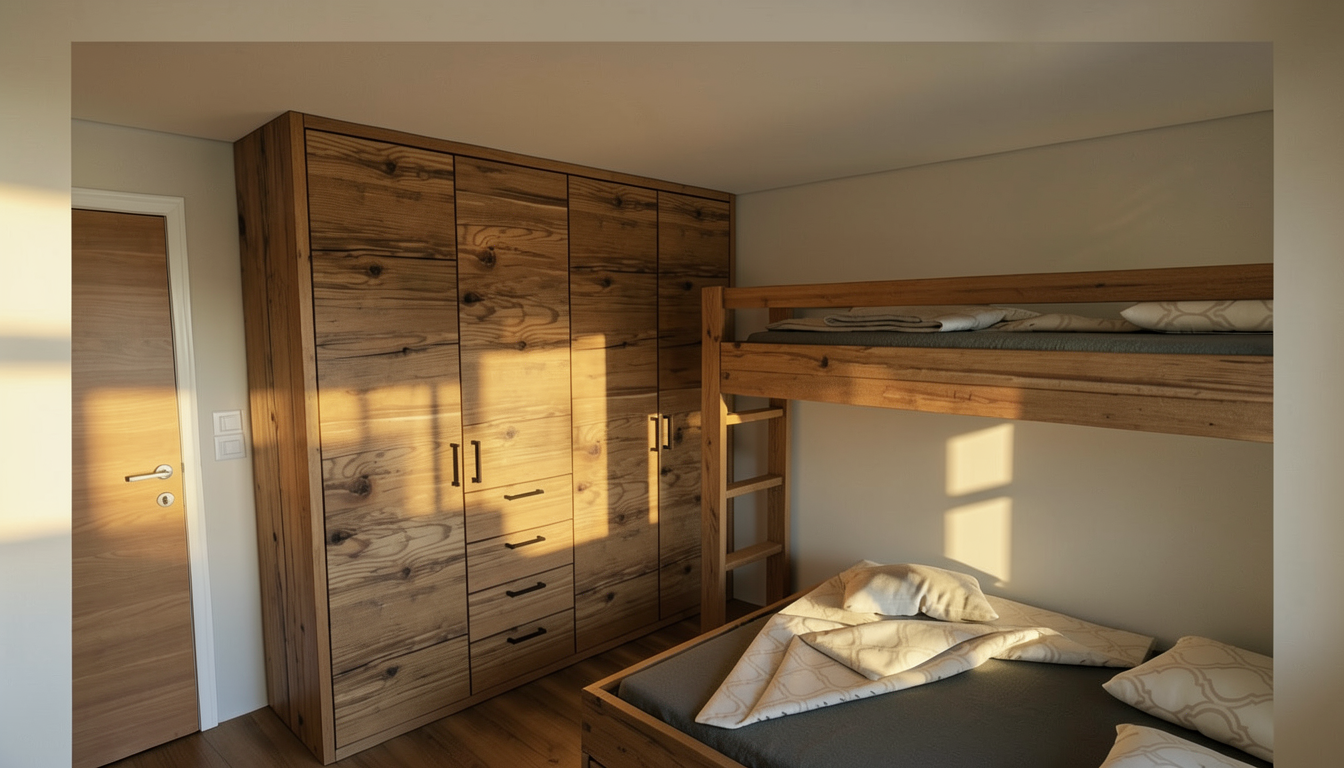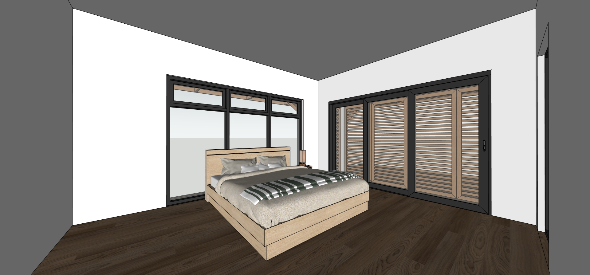 a serene bedroom seamlessly transitions into a lush tropical paradise the room features a plush cozy bed with soft white linens and a light brown textured throw blanket rich warm wood tones encompass the bed frame and floor creating an inviting earthy atmosphere large glass doors open up to a sunlit deck where natural light dances across the wooden floorboards casting gentle shadows a gentle breeze flows through the sheer cream colored curtains adding to the peaceful sunlit ambiance