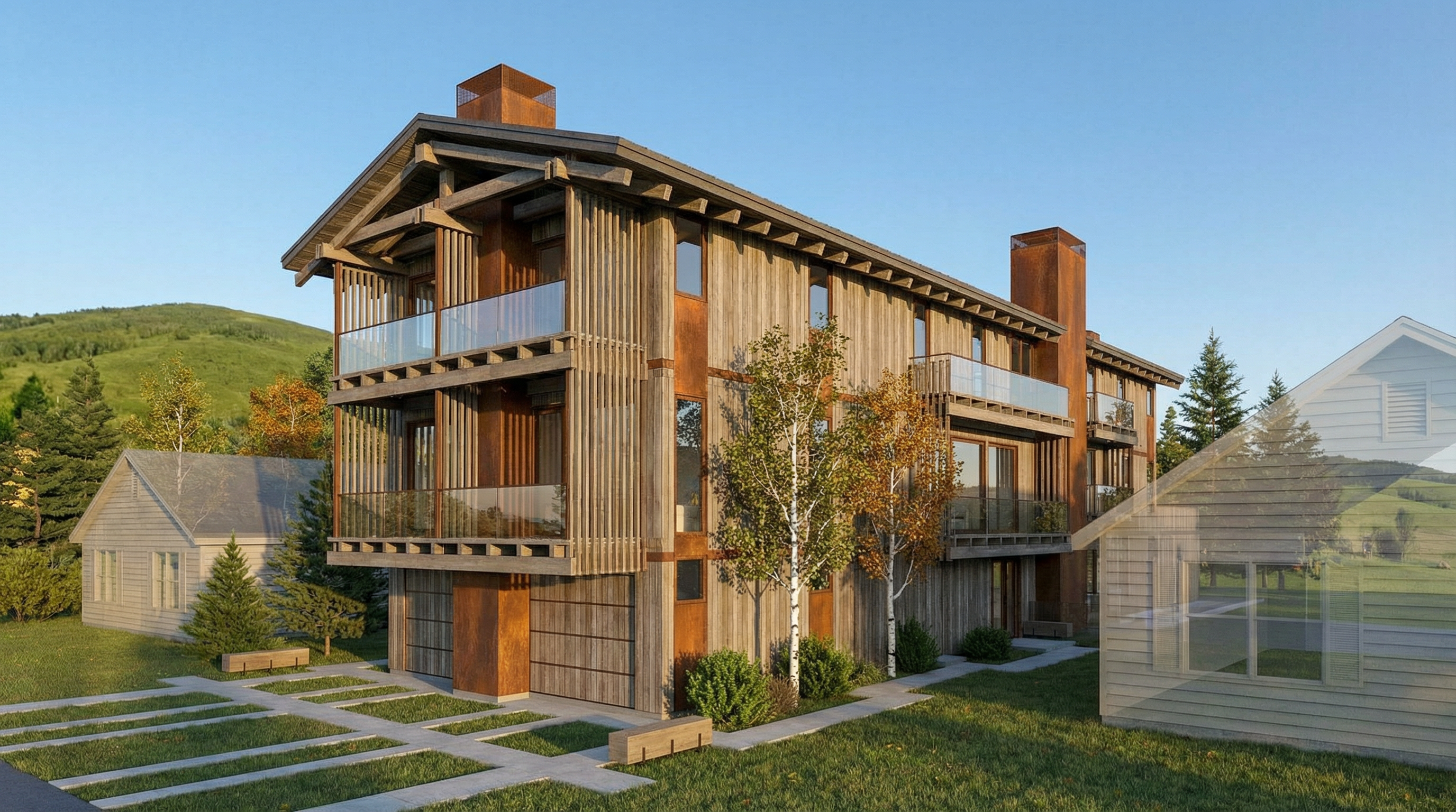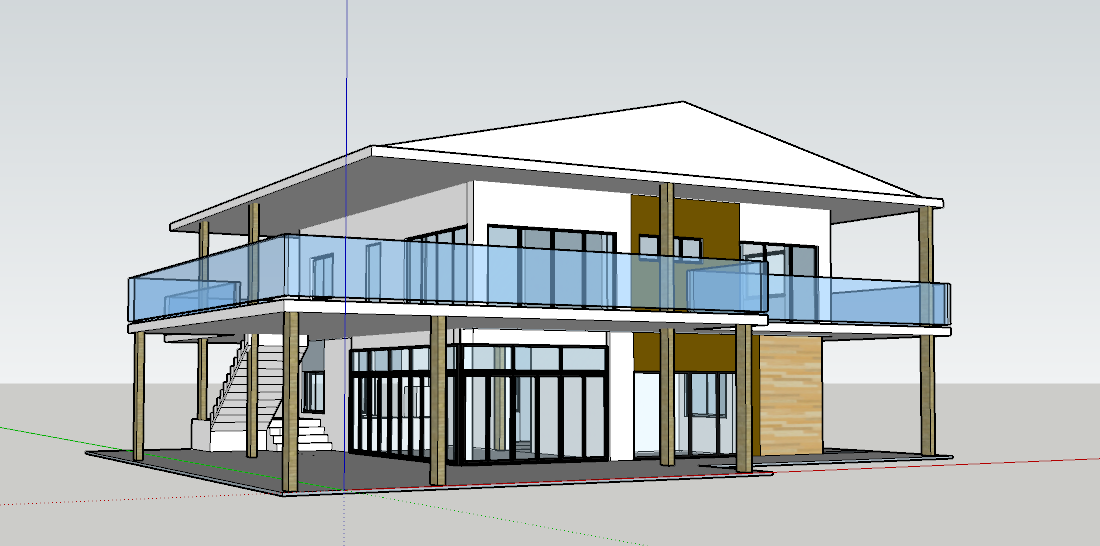 a modern two story house with a minimalist design the roof is white creating a clean and sleek appearance the walls are painted a soft white providing a bright and airy feel the balcony and upper floor railings are made of transparent glass with a slight blue tint giving a contemporary look the supporting pillars and beams feature a natural wood texture with a warm brown color adding contrast and warmth large glass windows and doors are framed in chic black enhancing the modern aesthetic a light stone facade element adds texture to the design with subtle beige and cream tones the overall atmosphere is calm and sophisticated set on a gentle overcast day for a soft diffused light