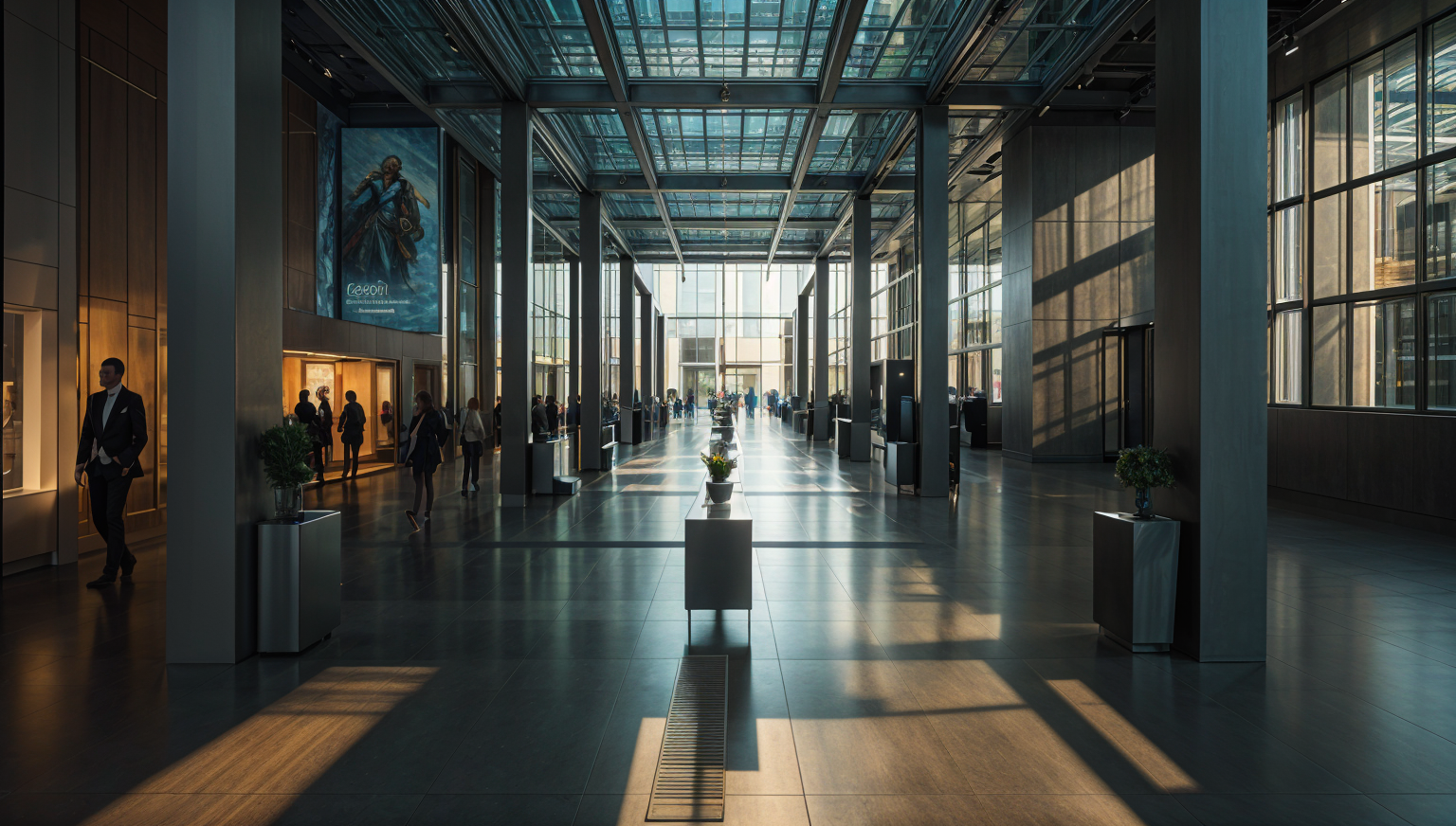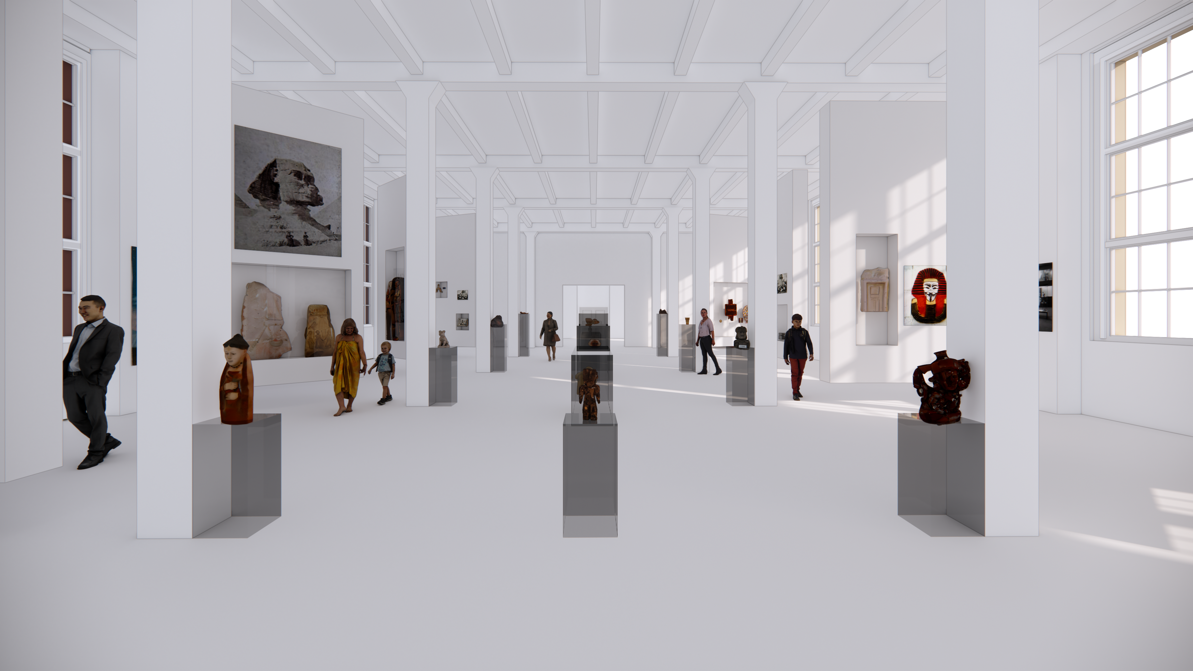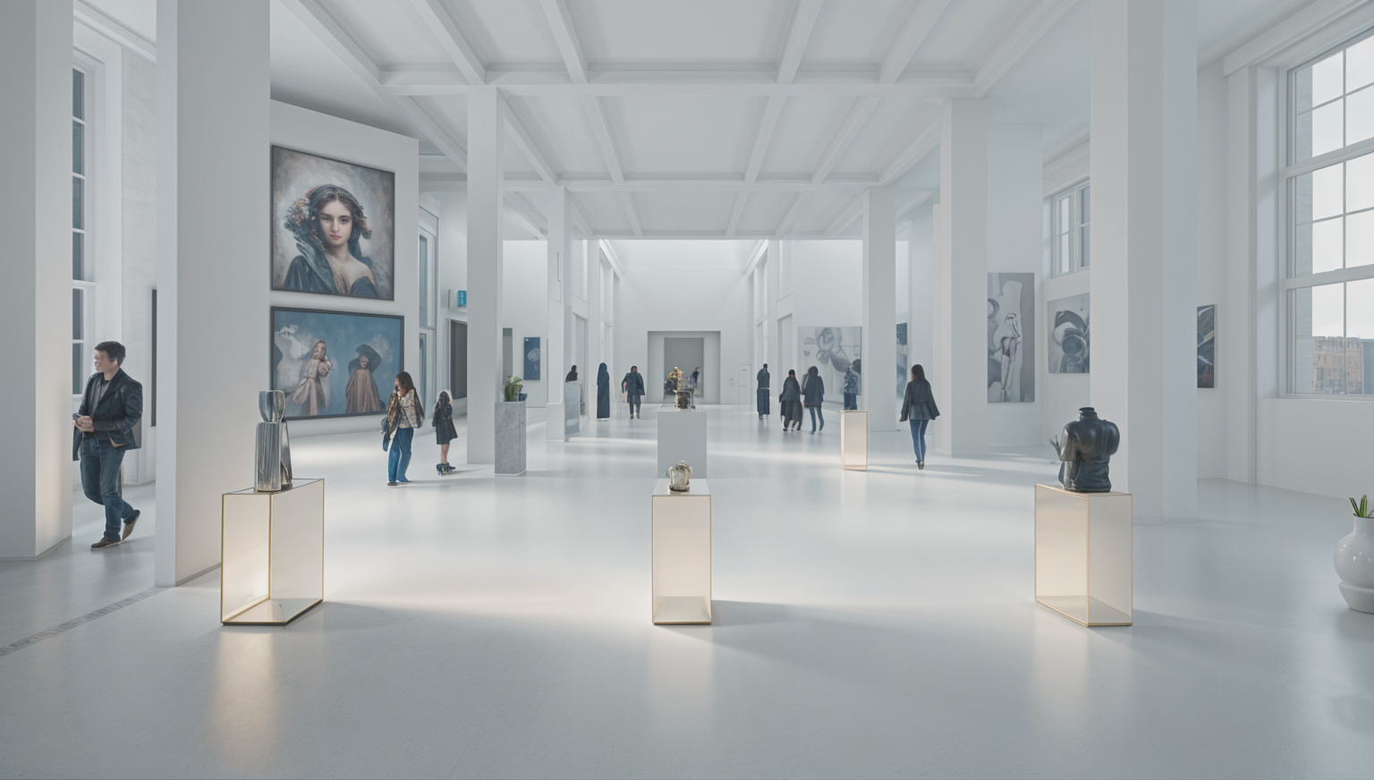 do not change the base image do not change the walls floor ceilling and the piece of art just make the render more realistic with better texture to have an immersive mood trasnparency architecture