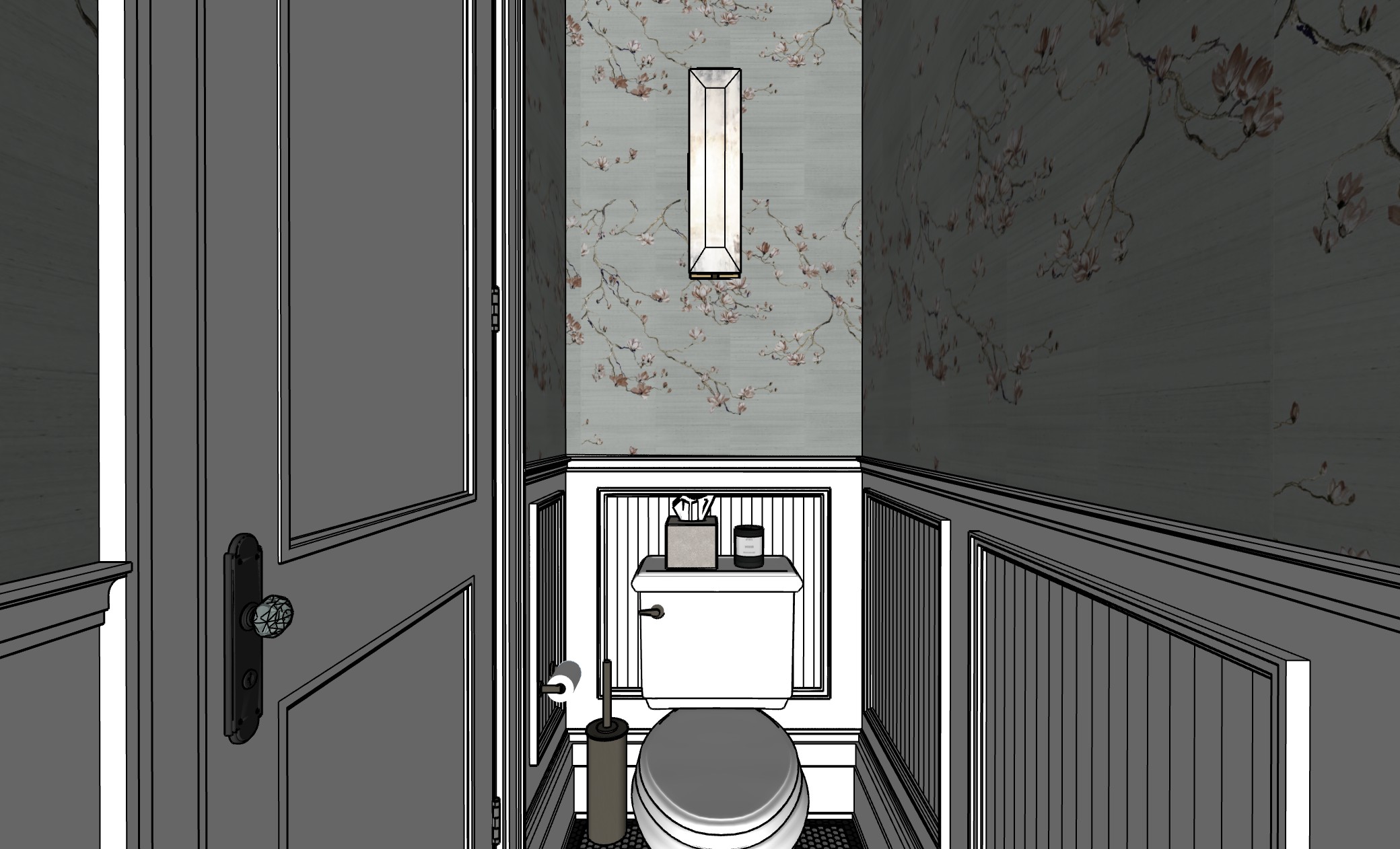 keep everything just make the toilet all white and the floor is white penny tiles