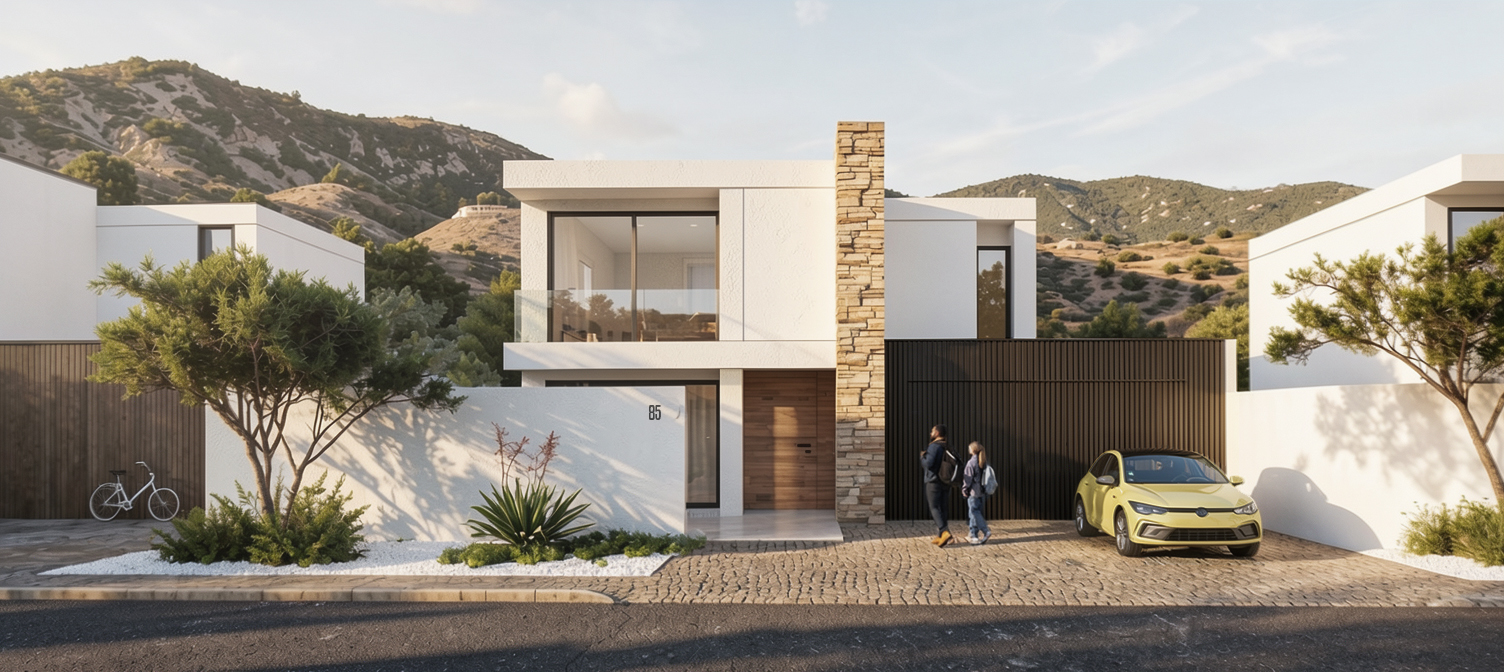 use the provided image as strict base reference preserve the original architecture composition camera position framing proportions and scene layout exactly as they are do not redesign reinterpret or add remove elements objective enhance the image to achieve a high end architectural editorial look refined poetic visually rich and photorealistic without altering the original design materials textures refinement improve realism of all materials stone plaster metal glass pavement add subtle micro texture and natural imperfections introduce slight tonal variation to avoid flat or repetitive surfaces maintain material authenticity no stylization no exaggeration avoid overly sharp noisy or artificial textures light atmosphere strict control preserve the original light direction and logic exactly do not change sun position or shadow orientation refine lighting to be more natural and photographic softer highlights balanced contrast gentle shadow transitions introduce a subtle atmospheric depth very light haze if needed avoid dramatic cinematic or artificial lighting effects reflections surfaces make reflections more physically accurate and slightly softer avoid mirror like or overly perfect reflections ensure correct roughness on all materials color grading apply a subtle editorial color grading slight desaturation for realism maintain a natural warm mediterranean tone if applicable avoid hdr look or excessive contrast vegetation context slightly reduce artificial appearance of vegetation add natural variation in tones and density keep everything controlled and not overgrown overall style architectural digest high end european editorial photography clean calm intentional composition poetic but restrained photorealistic not cgi looking critical constraints very important no change in architecture no change in composition no change in camera or framing no change in proportions no change in layout no added or removed elements no change in light direction no exaggerated textures no dramatic effects