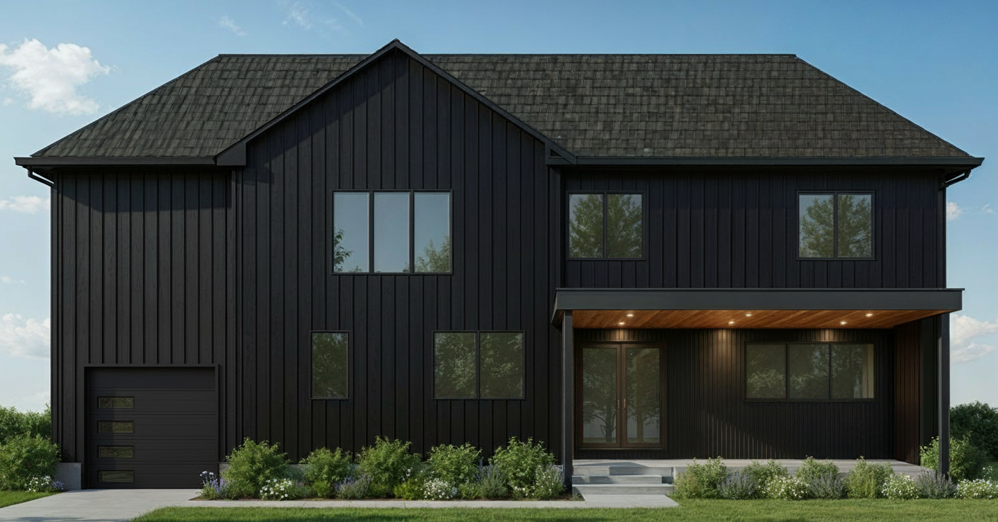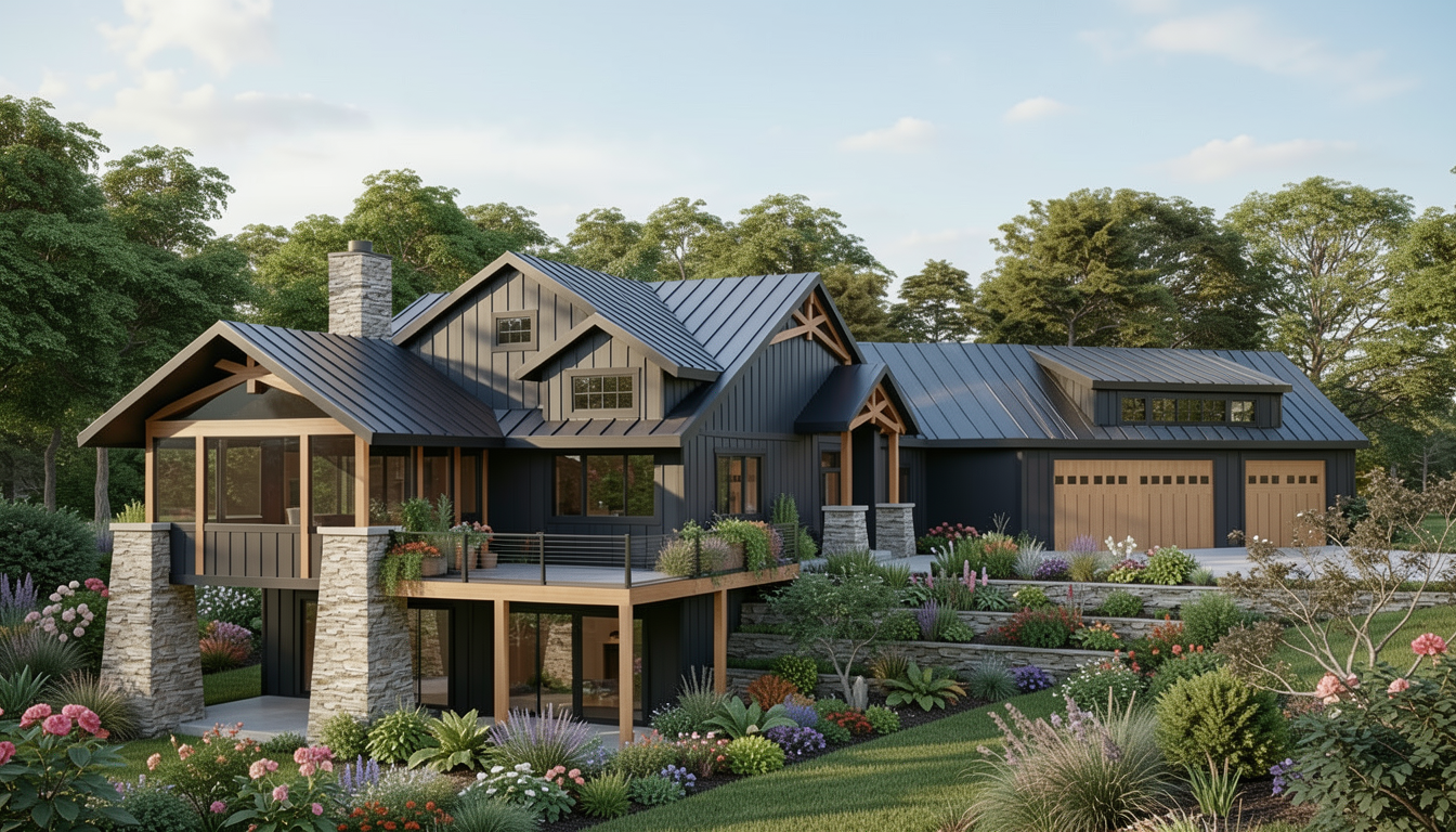 make as photorealistic as possible while keeping textures the same as shown light professional landscaping in greensboro nc 11am remove any text use the following finishes siding 7e9d9d shakes 7e9d9d black windows black window trim black roof black soffit and fascia 2e2e2f front door steinhaus stack ledge dutch quality stone black garage doors in design as shown 8b5e2a posts and rails