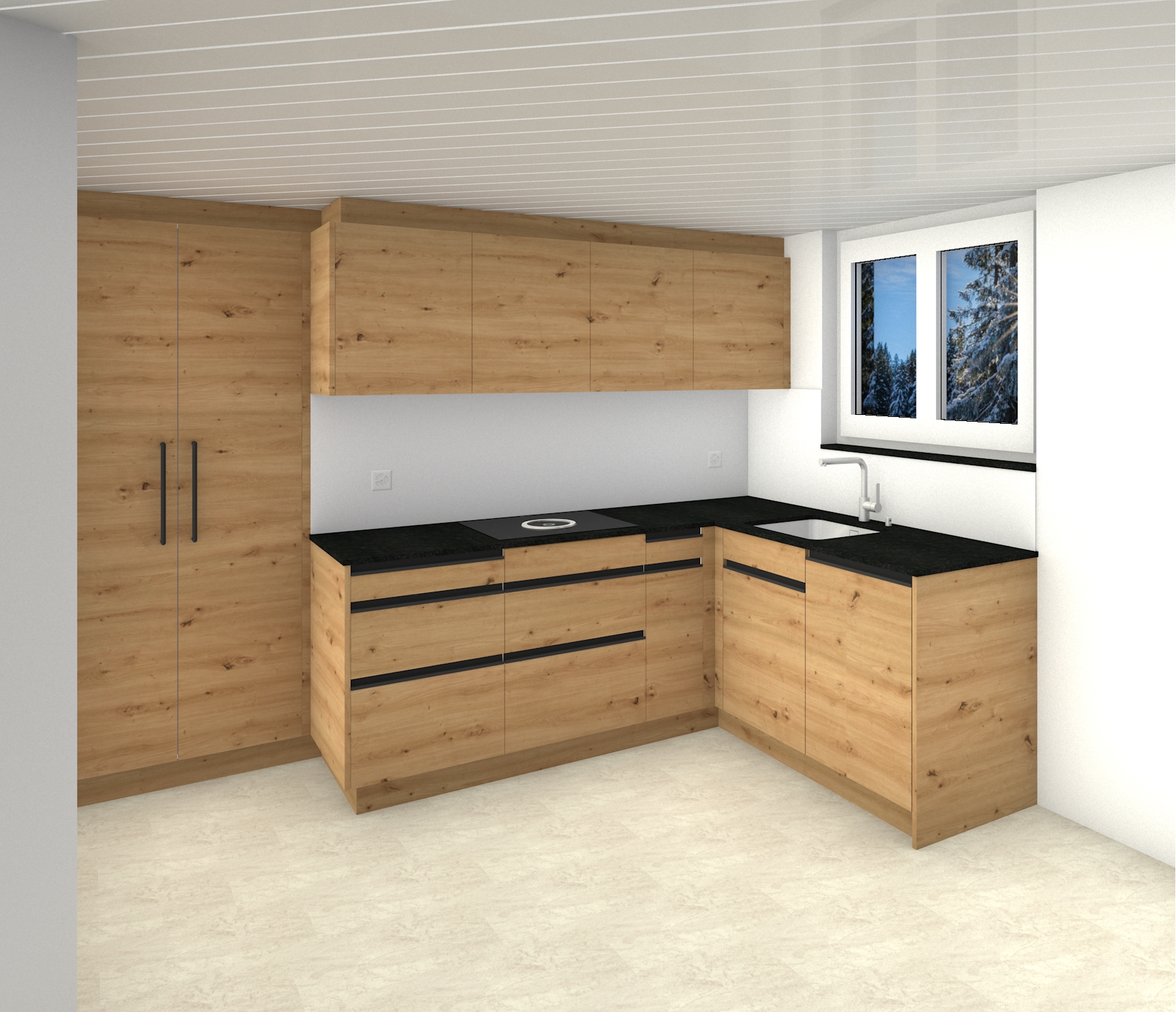 die zwei steckdosen sollen ersichtlich und weiss sein die r ckwand ist aus glas aber das glas soll nicht stark spiegeln die granit abdeckung soll matt sein mit leicht rauer oberfl che der weisse ring vom kochfeld soll wieder ersichtlich sein aber er soll schwarz sein der ring in der mitte vom kochfeld soll fl chenb ndig und schwarz sein die k che soll gen gend licht erhalten dass sie hell ist die armatur ist edelstahl glanz das waschbecken ist edelstahl glanz beim fenster draussen sollen tannen mit schnee ersichtlich sein