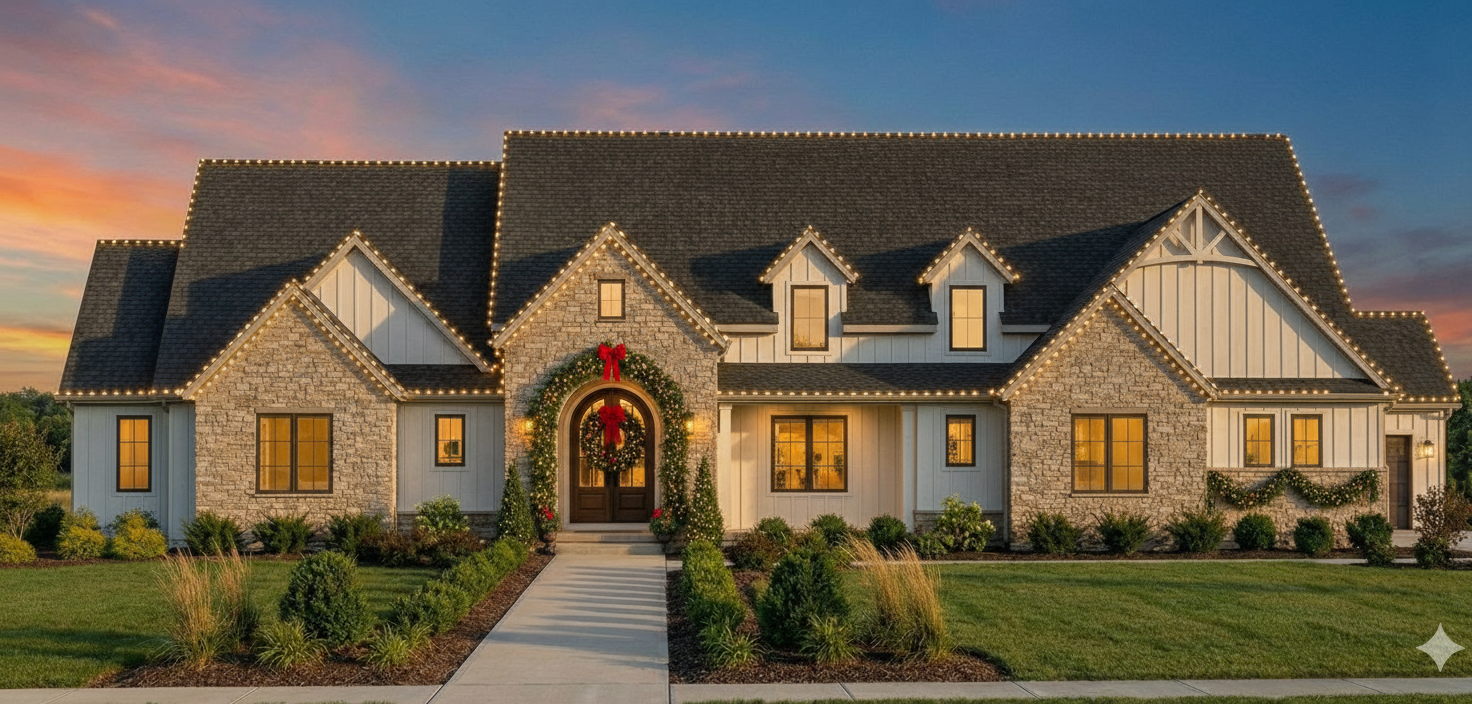 create high resolution real vibrant photo with plush trees and bushes with vibrant blue sky keep all details exact as original create a fresh spring settings green grass a country french theme country french blue shutters with off white brick and complimentary stone
