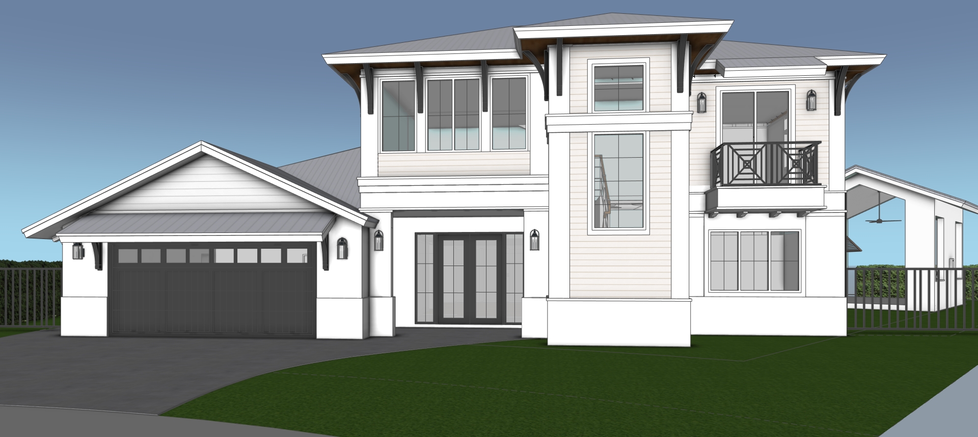 photo realistic beautiful sunny day with blue sky luxury tropical suburban landscape with beautiful bushes in the grass area silver metal roof white walls with white siding accents white framed windows with divisions this is a luxury west indies style house with a dark brown garage door front door also to be dark brown with glass the balcony railing to be dark brown and the architectural brackets in dark brown
