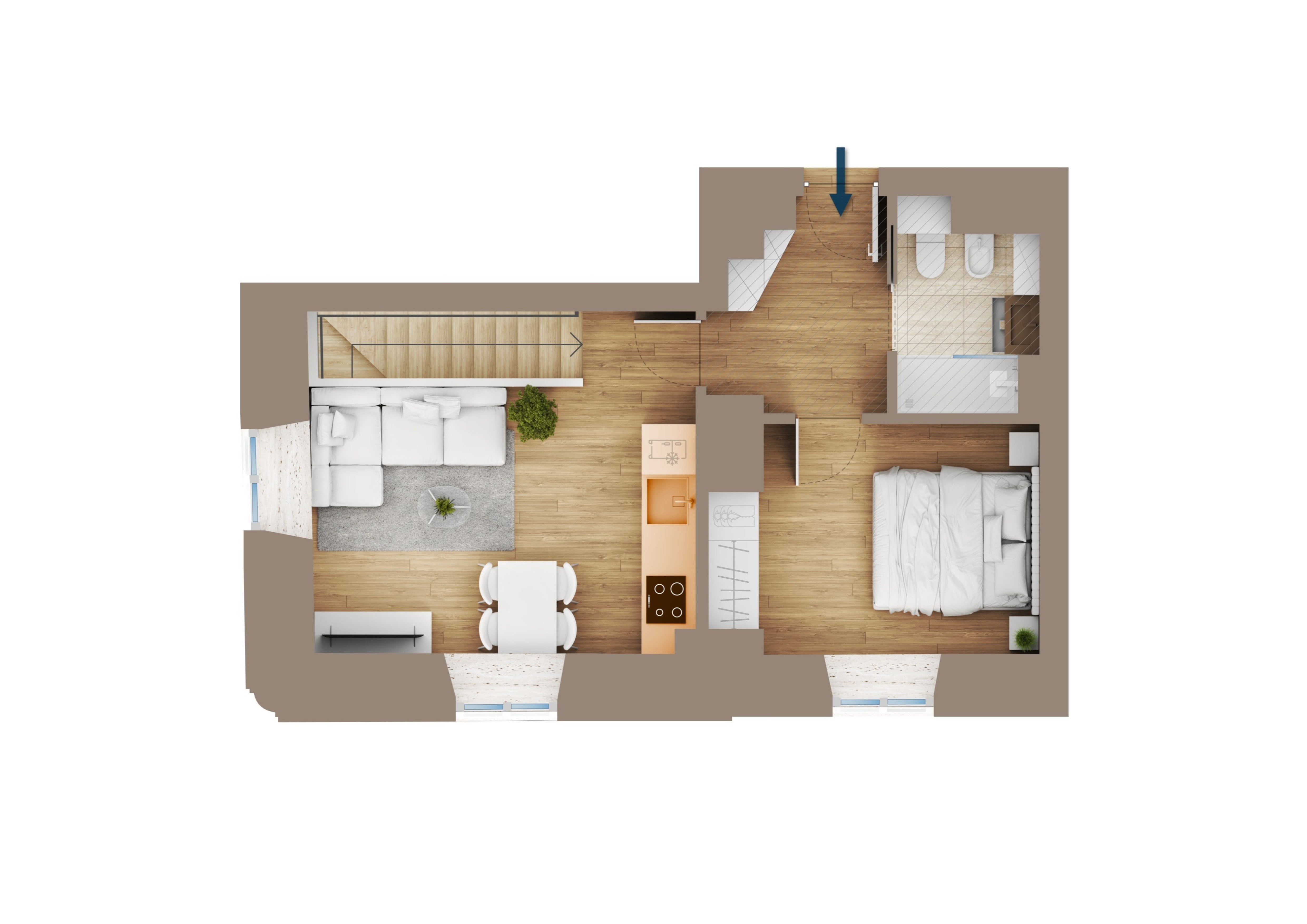 convert this floor plan into a realistic isometric 3d view of a full house show the space from an elevated angle with furniture walls and details visible sfondo bianco use the same furniture as shows on the plan do not change the orientation of the floorplan