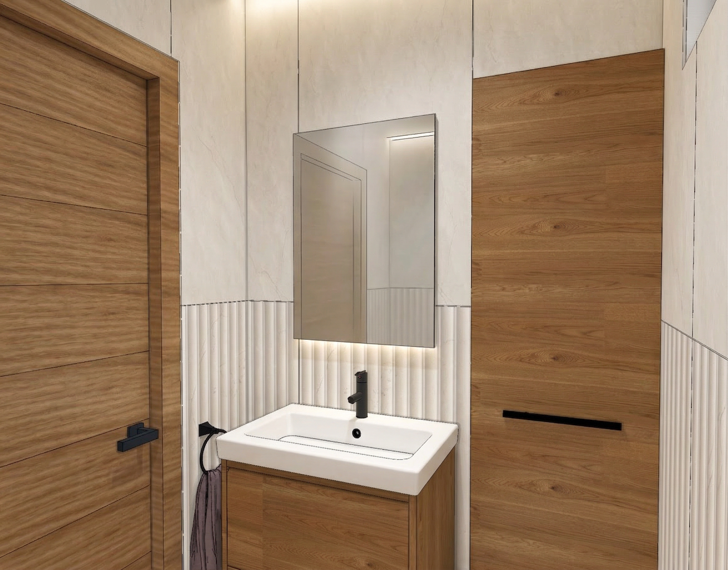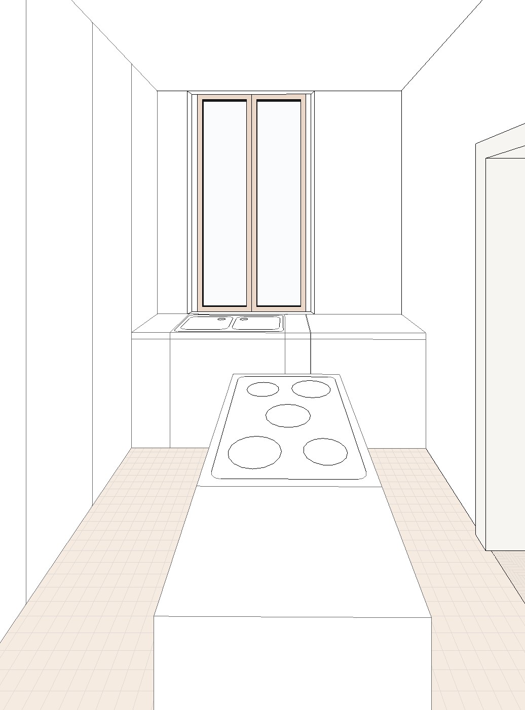 crea un render fotorealistico di questa vista 3d la vista ritrae una cucina moderna con una piccola isola al centro i piani di lavoro sono in marmo grigio con venature bianche i mobili sulla sinistra della cucina sono colore grigio beige e sono a tutta altezza nei mobili sulla sinistra posiziona anche il forno i mobili sulla parete finestrata sono colore legno scuro e caldo i mobili sono in stile moderno il pavimento in gres 60x60cm effetto terrazzo moderno con colori caldi