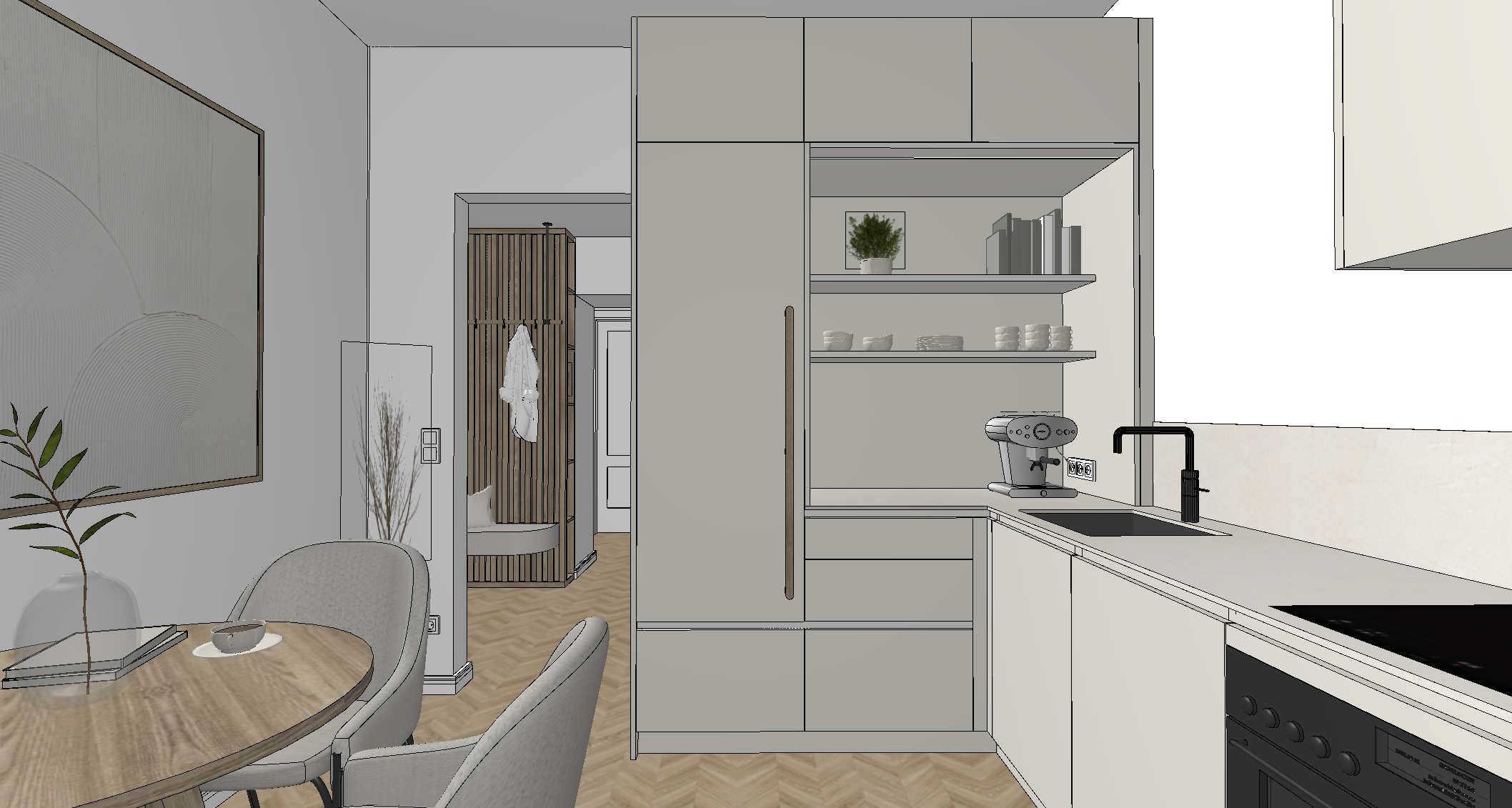 altbauwohnung in salzburg warme lichtstimmung sonnenlicht von au en einfallend fussboden heller eiche w nde und innent ren in wei k che in hellem beige mit beleuchtung in der k chennische waschbecken und armatur in edelstahl arbeitsplatte in heller steinoptik travertin k chendekoration