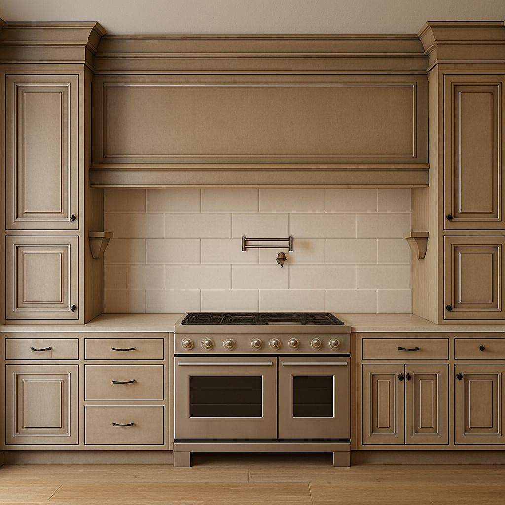do not change the cabinets at all preserve the exact cabinet colors materials finishes door style drawer style hardware proportions reveals geometry and alignment exactly as shown do not alter the countertop flooring walls ceiling angles perspective lighting direction appliances or any architectural elements keep the camera viewpoint absolutely identical only remove clutter construction materials and unfinished areas clean the room and make it look fully finished add only minimal tasteful staging items appropriate for the space do not add any furniture or change anything about the cabinets countertop or room structure no cabinet changes no perspective changes no angle changes no color changes no resizing no shape changes no geometry changes no filler changes no hardware changes no new cabinetry no wall changes no added shadows that distort structure add a slide in range below the hood the fits the opening do not add more cabinets at all cabinet layout remains the same do not add more cabinets to the opening make the range fit the opening as is