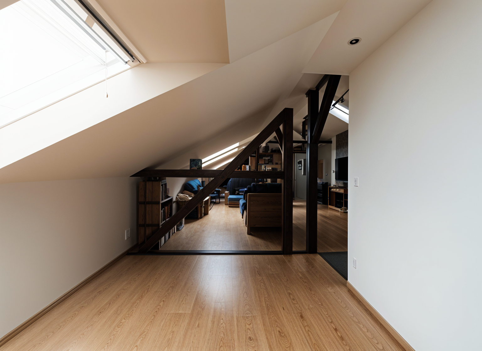 building lobby with wood wall paneling dark stained concrete floors with brass details