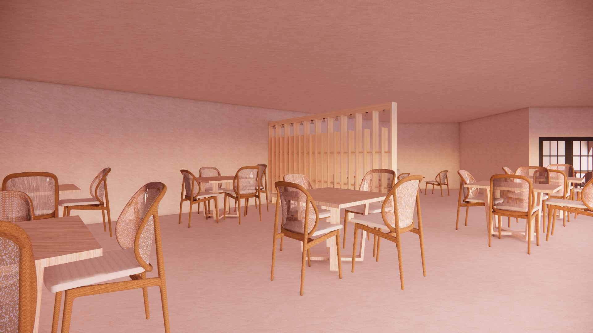 a high end caf and hookah lounge interior in djibouti asta studio preserve the existing layout materials and mood exactly including the wood accented ceiling soft beige plaster walls woven pendant lamps natural light and custom wood furniture the design should remain unchanged only enhance the lighting realism atmosphere and visual richness the space includes comfortable booth seating along one wall and light wood tables with rattan chairs at the center behind the booths keep the vertical wooden branch wall feature that adds rhythm and warmth through the arched openings maintain a view toward venice road djibouti with a glimpse of the marina and sea water reflections in the distance add elegantly designed hookahs placed on some tables modern forms with glass bases metallic stems and subtle decorative hoses that blend seamlessly into the aesthetic they should enhance the lounge atmosphere without feeling cluttered or overly ornamental lighting create a cozy evening ambiance with soft amber tones warm ceiling lights and diffused glow from the woven pendants accent lighting should gently emphasize material textures the plaster wood and cane creating depth and comfort subtle reflections on the floor and glass surfaces evoke a high end inviting mood the overall feeling modern arabic luxury infused with natural warmth a tranquil elevated environment where contemporary design meets cultural comfort keep every design element intact while enriching lighting material depth and atmospheric storytelling