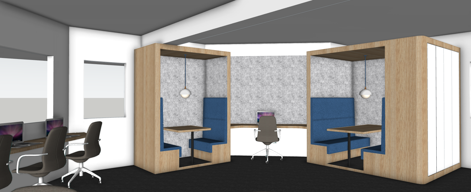 down lights in white ceiling windows in with view to garden in window grey carpet white bessa block walls school kids sitting in booths and seats