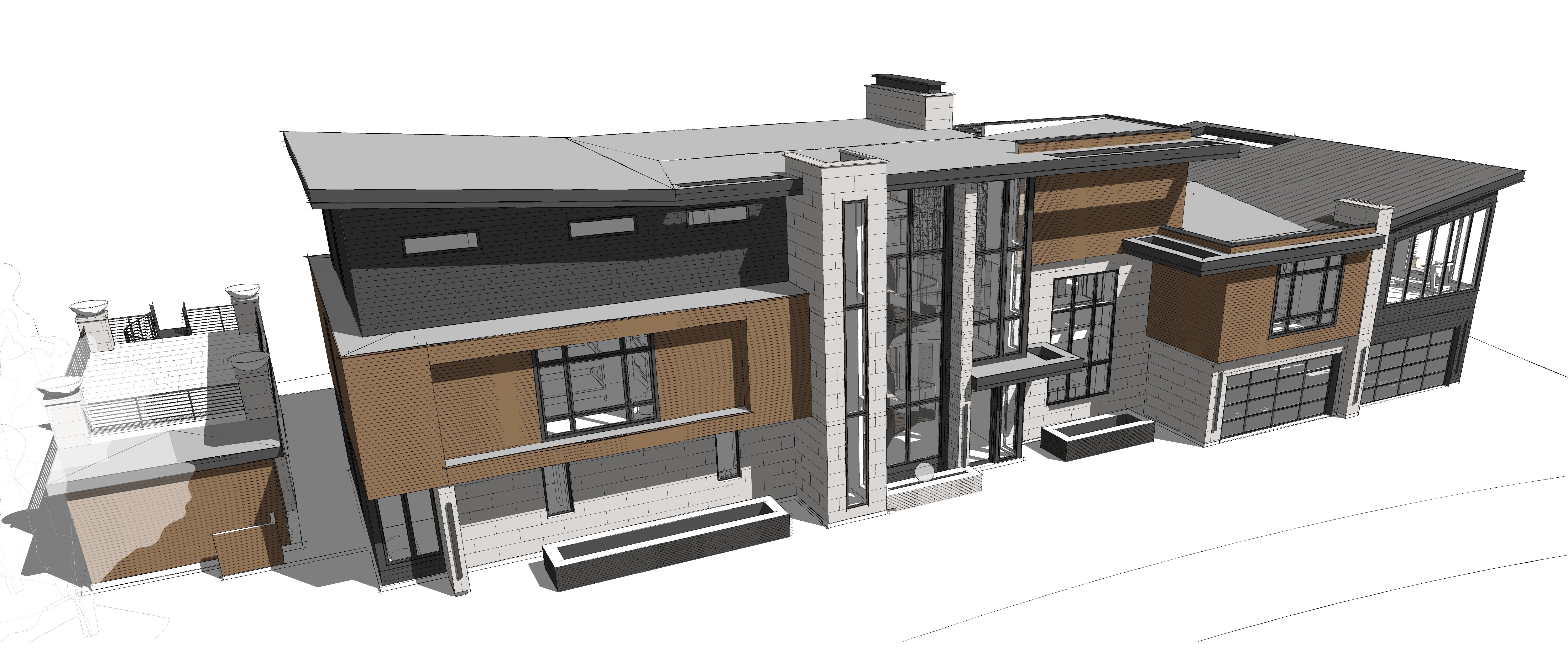 keep modern rectangular stone black slate siding on the dark grey areas of the house smooth limestone at stone areas glass garage doors