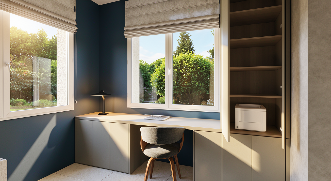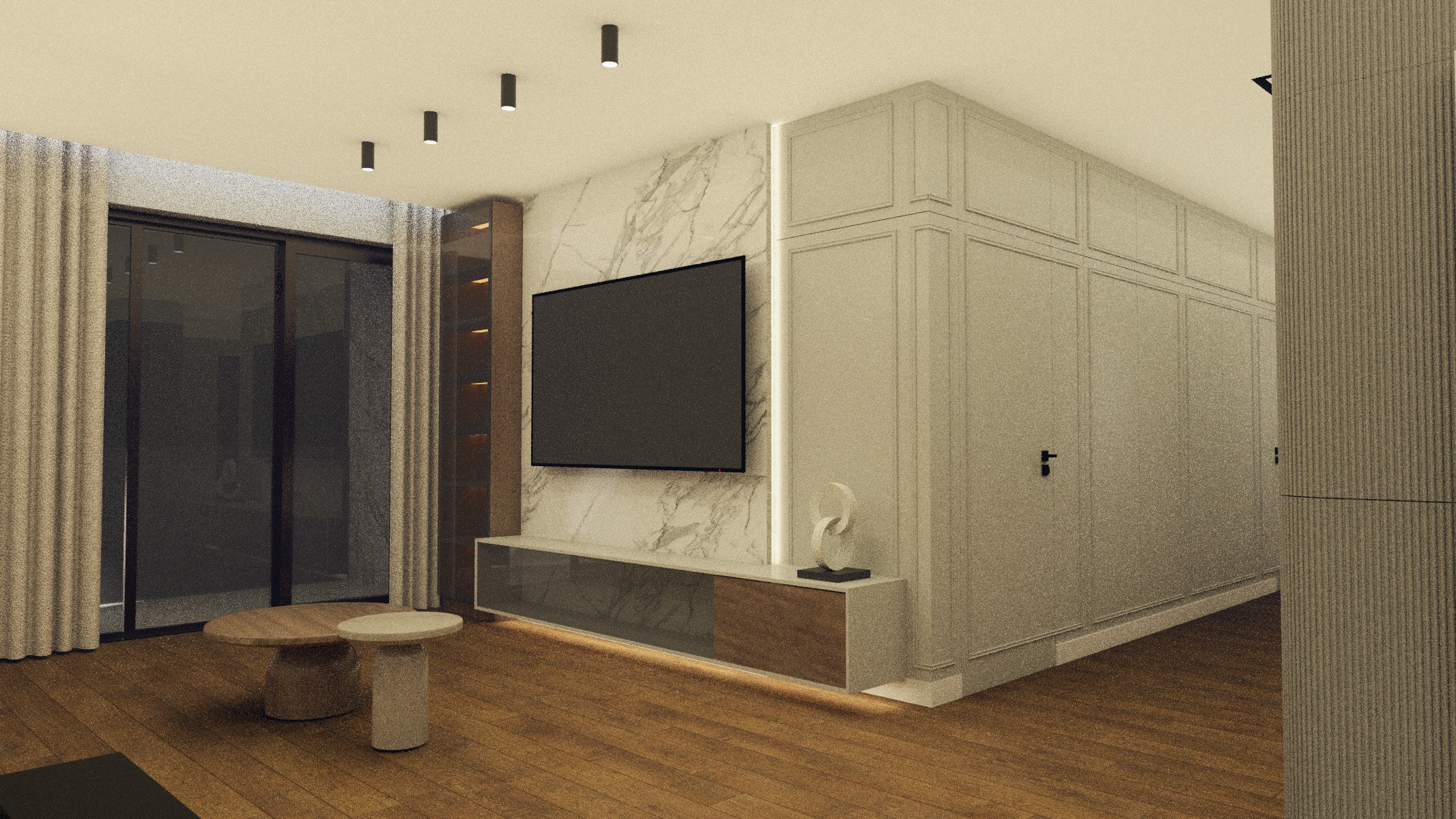 render a sophisticated modern living room with warm lighting the floor is polished hardwood in a rich medium brown tone the walls feature elegant gray paneling complemented by a smooth white marble accent wall with subtle gray veining a sleek black flat screen tv is mounted centrally above a minimalist console with glass and wooden elements in a deep walnut finish a pair of nesting tables in contrasting light beige and brown sits on the wooden floor enhancing the cozy atmosphere floor to ceiling curtains in a soft beige frame large glass doors creating an inviting airy feel add ambient lighting with black ceiling spotlights casting a gentle warm glow throughout the room