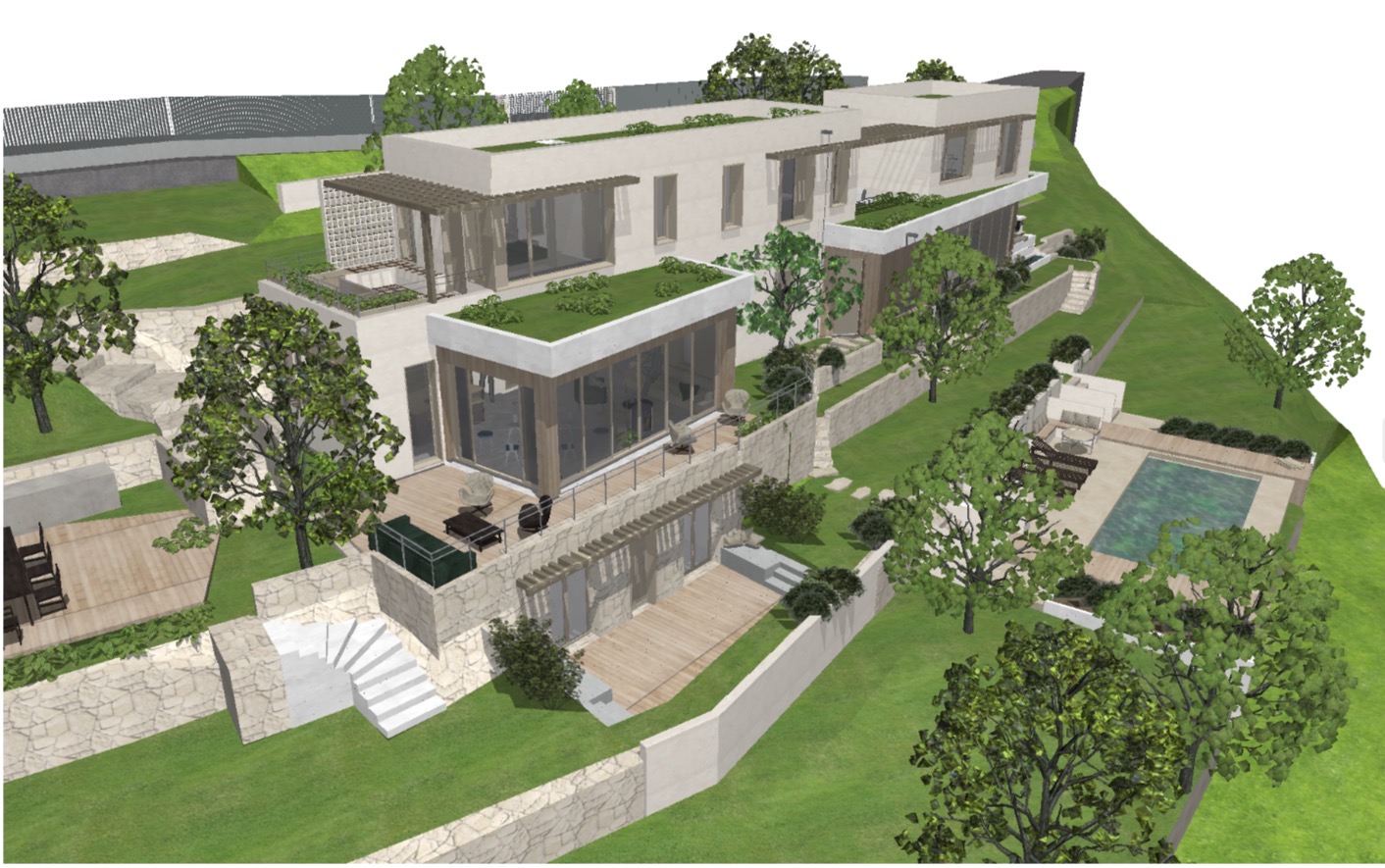 all trees are olive tree there are a mix of mediterranean plants in the restanques there are mediterranean pine trees in the background the facade is color gibraltar from prb