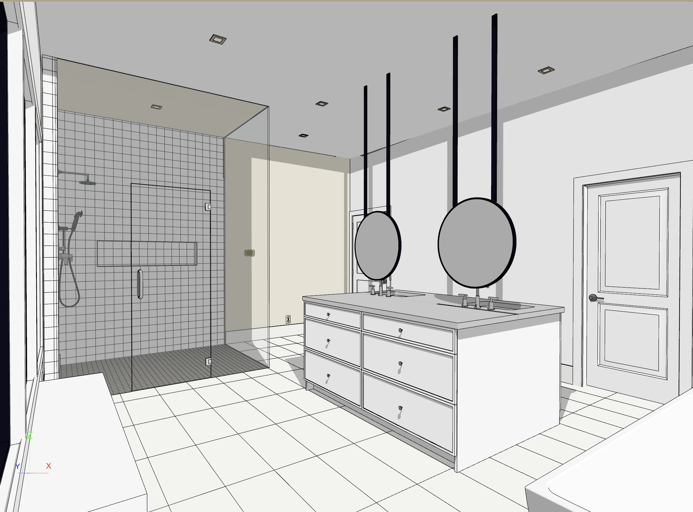 vanity cabinets and bench near window will be red oak in raw umber stain countertops will be seal pearl quartzite bathroom floor will be akdo primal in color sand 12x24 shower floor tile will be same tile but 2x2 shower walls will be bespoke studio zellige wheat tile 4x4 walls will be griege plaster
