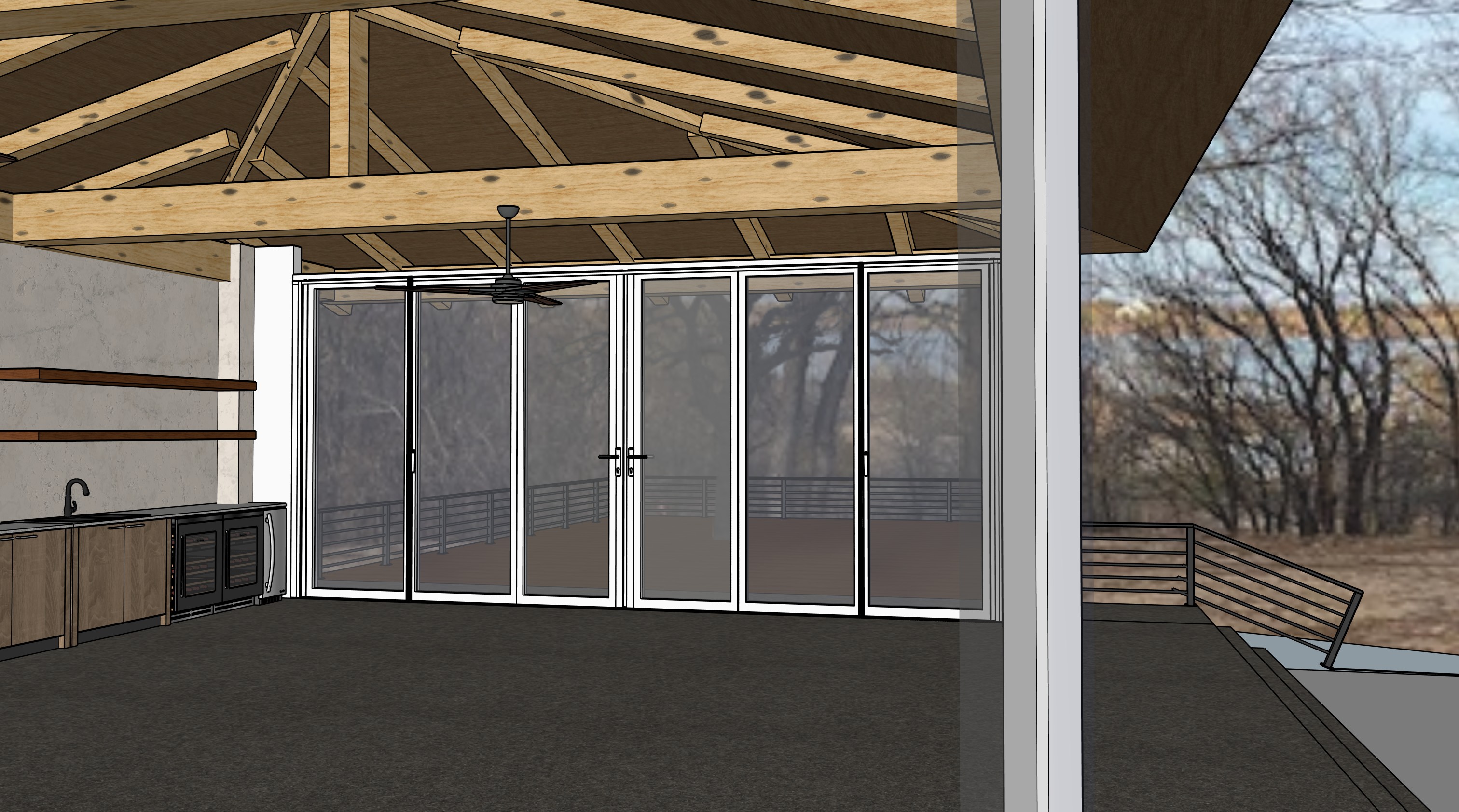 interior shot render section view through glass sliding door of the pavilion with stained concrete floor cedar wood rafters and wood panel ceiling and wood soffit on the exterior