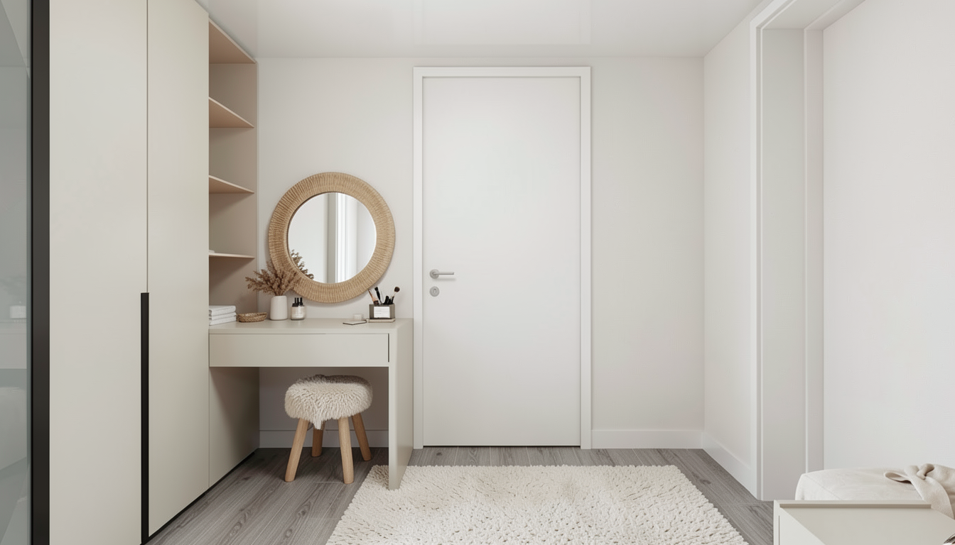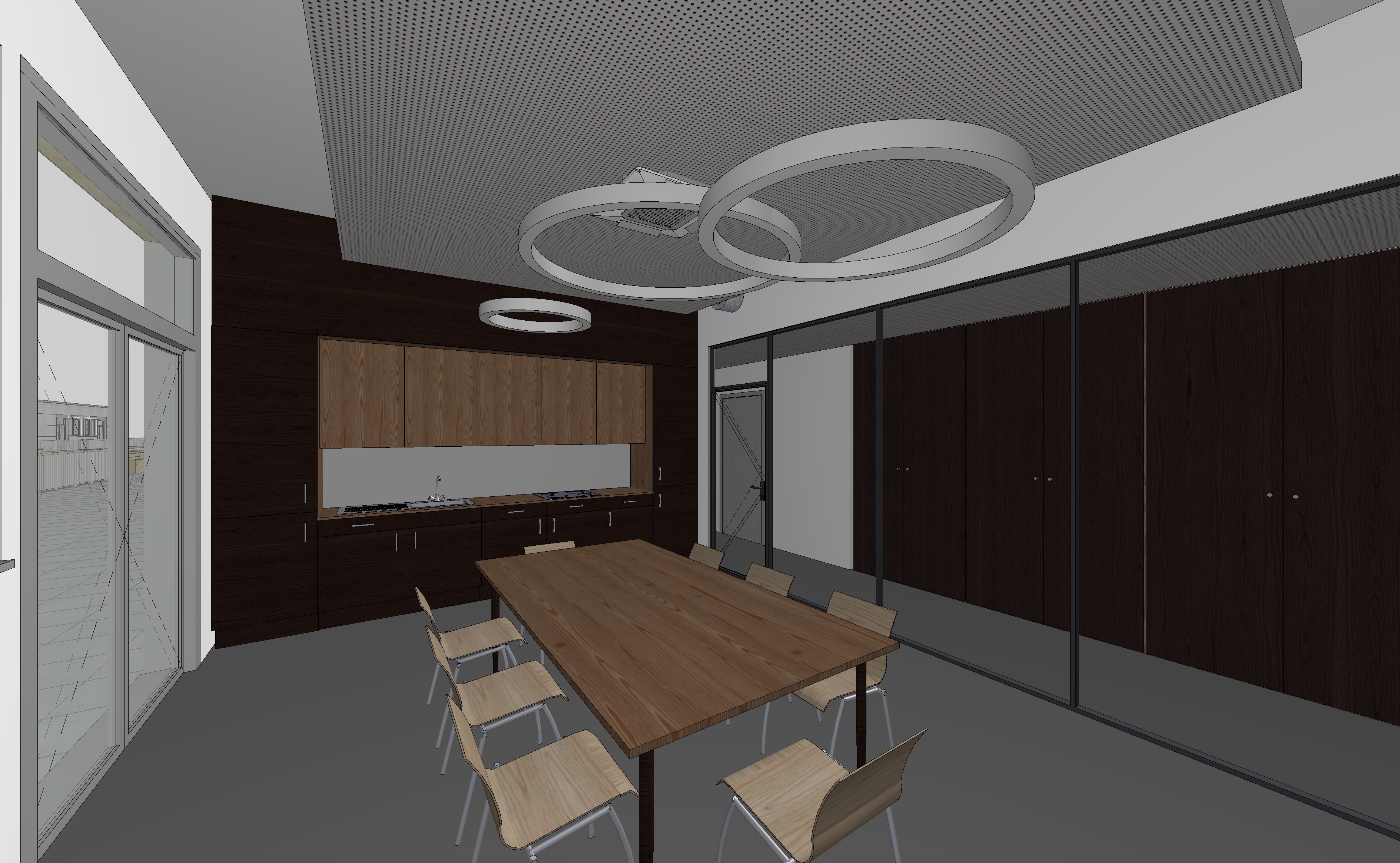 enhance this architectural interior render to achieve a clean photorealistic result while keeping the exact same design and geometry do not change add remove or move any objects scene description a modern meeting room with a matte gray epoxy resin floor in the center there is a rectangular natural wood table surrounded by light wood chairs with metal legs at the back there is a wooden kitchen with upper and lower cabinets including a sink and cooktop the walls are finished with dark wood panels on the right side there is a glass wall with black metal frames on the left side there are large glass doors windows the ceiling has white perforated acoustic panels with suspended circular ring lights from the regent circular lighting series the lights are turned on emitting a soft even diffused white light typical of high end architectural luminaires they are hanging from the ceiling with thin clearly visible suspension cables physically accurate and subtly catching light so they remain visible but delicate materials should look realistic natural wood grain matte epoxy resin floor and high quality architectural materials lighting should be soft natural and professional similar to interior architectural photography combine natural daylight with the artificial light emitted from the regent circular fixtures ensuring balanced exposure and realistic global illumination with soft shadows the glass must remain clean and subtle with very soft reflections and high transparency avoid strong reflections or mirror like effects the exterior visible through the glass must remain neutral and empty with no buildings people or objects visible outside keep the original composition furniture proportions and architecture exactly the same only improve lighting material realism texture quality and overall photorealism