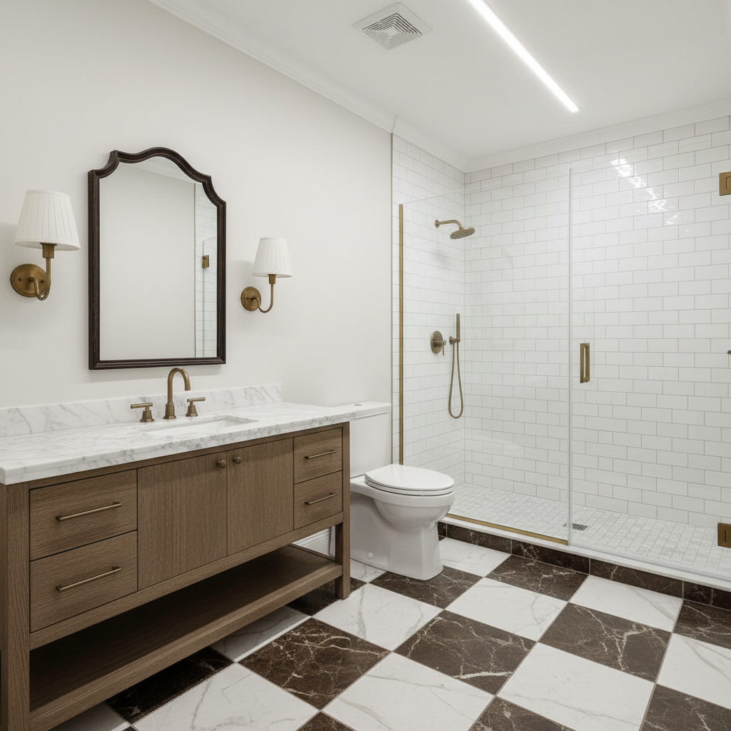exterior shot make the shower a tub wih the marble as the tile and have the vanity facing the tub and a window on the back wall