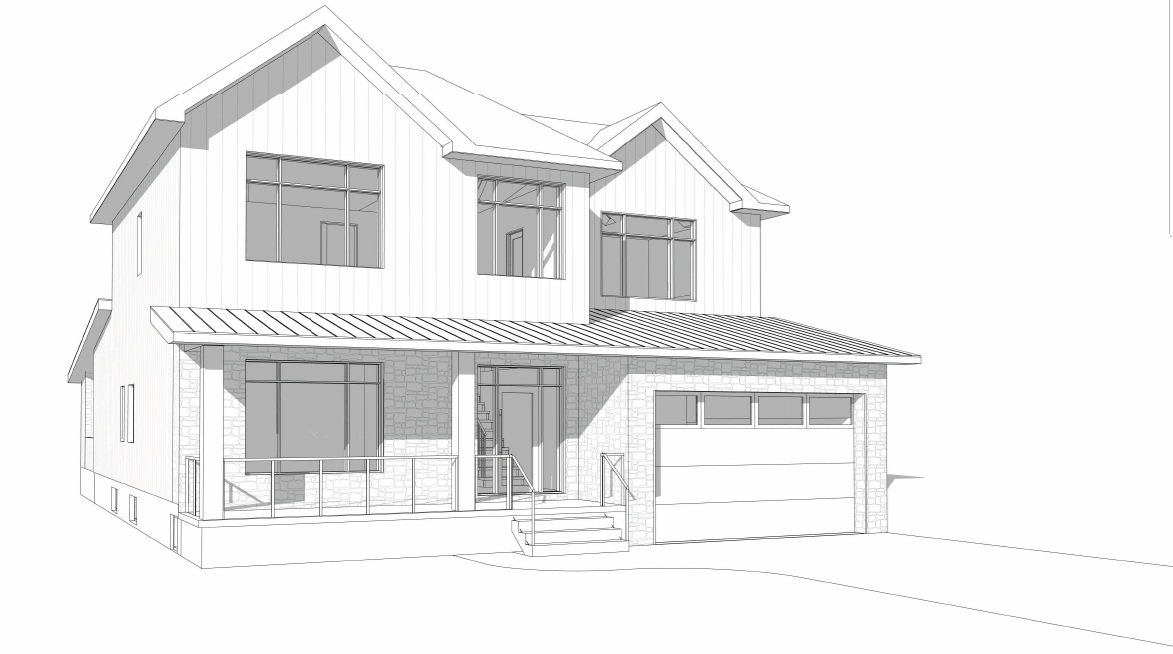 can you make a realistic 3d rendering with the given picture make the shingled roof a black grey shingle the metal standing seam roof to be black siding to be white board and batten james hardie and the soffit fascia eavestroughs all to be black aluminum