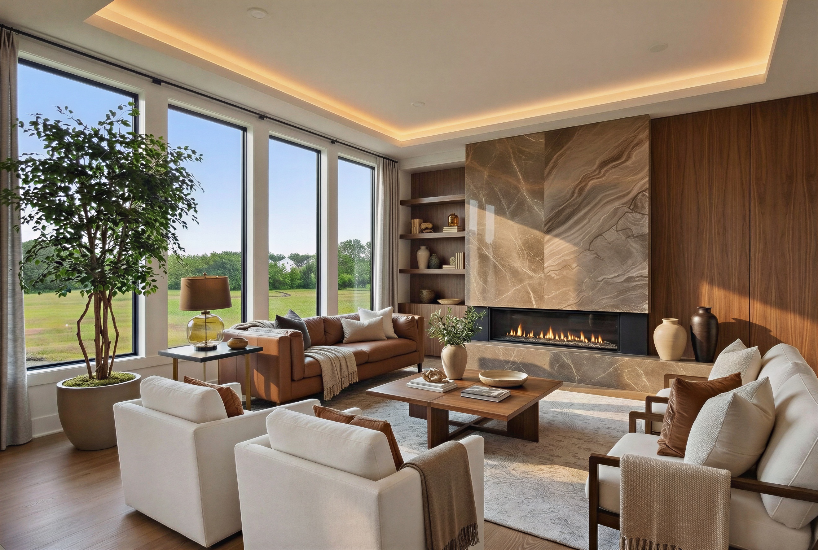 change stone fireplace to a more masculine marble remove tree from corner change to a lighter wood stain color add wood ceiling