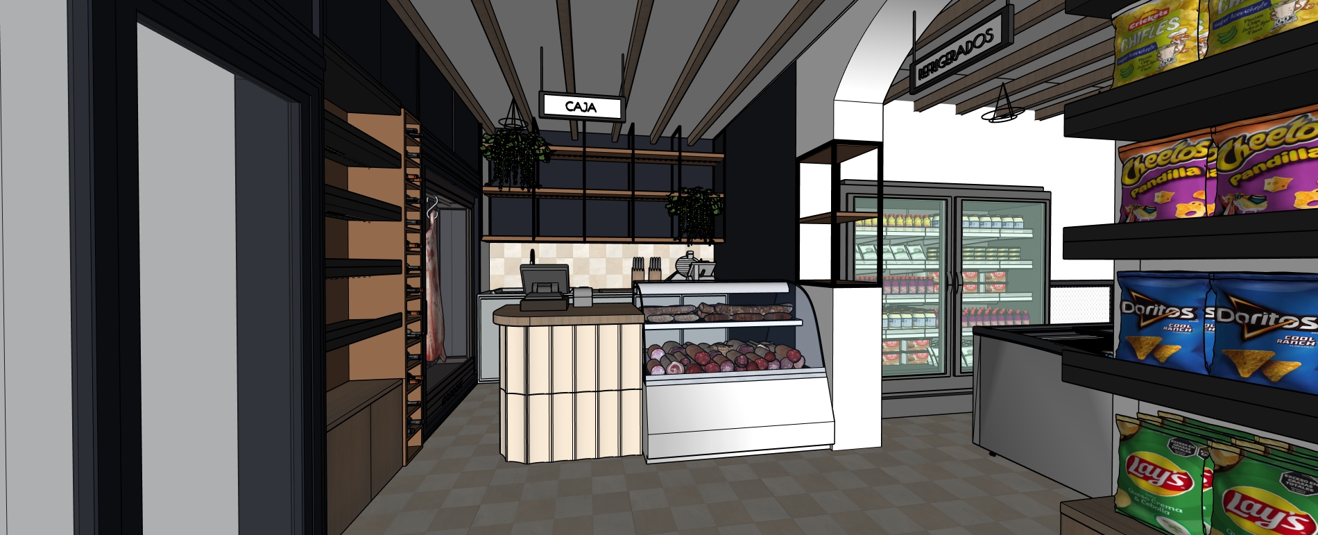 necesito una imagen fotorealista a partir de esta imagen mejora texturas y elimina el ruido la luz natural entra por la izquierda de la imagen no a adas ni elimines elementos el material del suelo es una baldosa de 20x20cm combinando blanco y beige en el mostrador hay unas piezas colocadas debajo dela encimera que son porcelanico brillo en tono nude la imagen se ve demasiado iluminada la nevera que tengo a la izquierda donde ves un trozo de carne quiero que sea un expositor de quesos el mostrador no llega al suelo por favor haz que llegue al suelo
