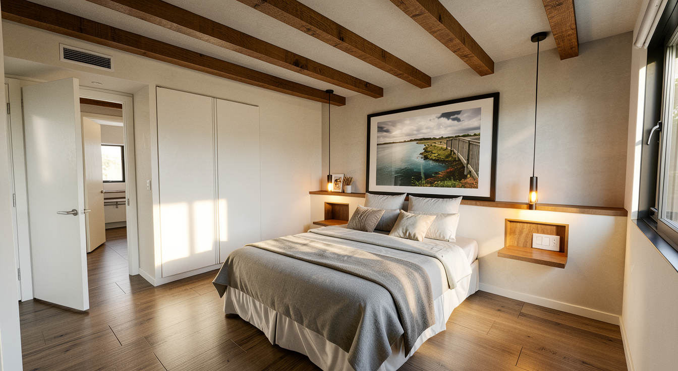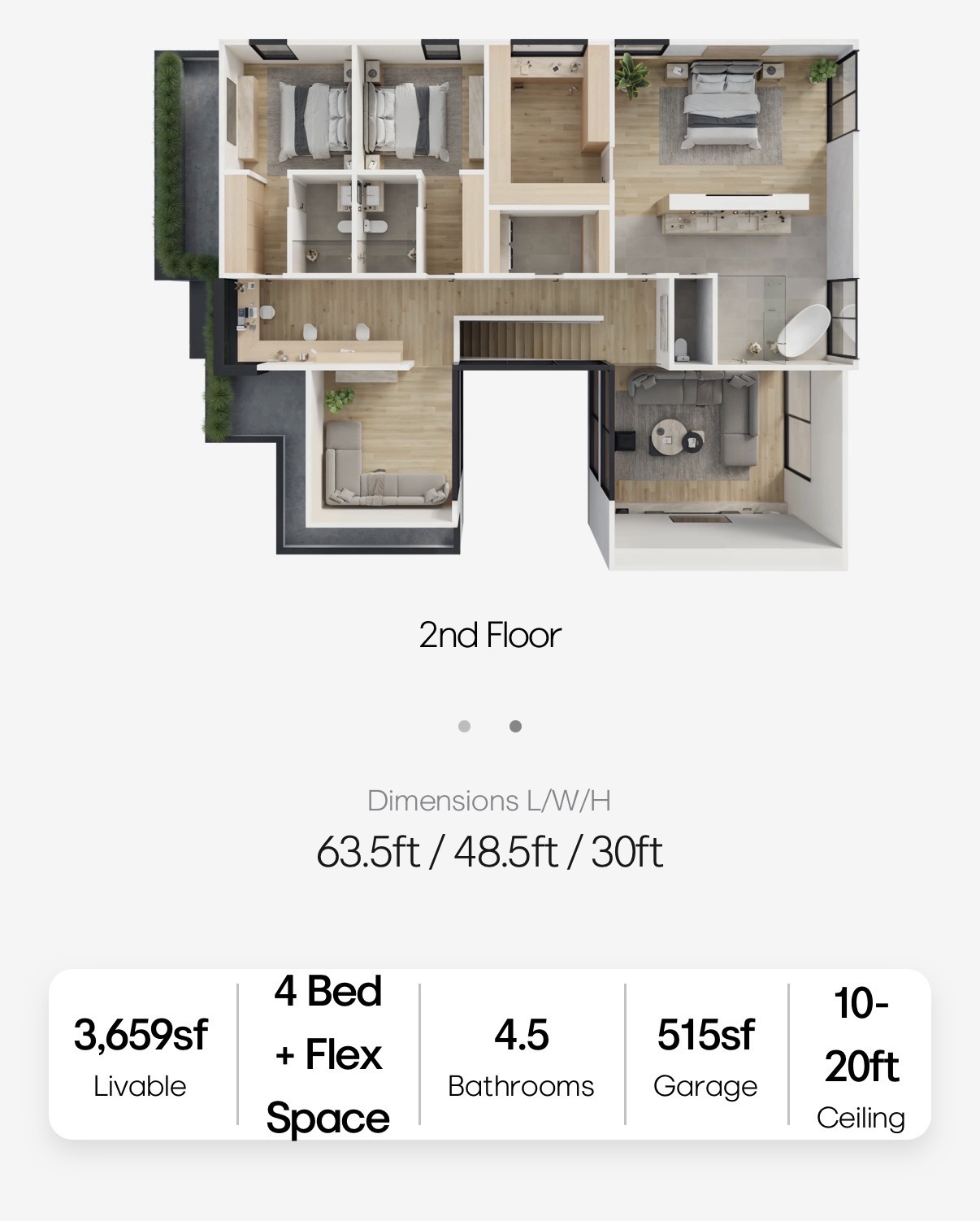 convert this floor plan into a realistic isometric 3d view of a full house show the space from an elevated angle with furniture walls and details visible create a stunning architectural rendering of a modern 2nd floor layout highlight four spacious bedrooms with a mix of soft grey and creamy white bedding featuring sleek minimalist furniture add vibrant indoor plants to the corners use light brown and beige tones for the wooden floors and accents throughout the bathroom areas should be illustrated with cool grey tiles and white fixtures depict an open living space with contemporary understated furniture using neutral colors and adding a pop of green from indoor plants the kitchen area should include natural wood textures with light airy atmospheres emphasize the overall serene and modern ambiance incorporating large windows for natural light to flood in maintaining a clean fresh feel throughout use the same furniture as shows on the plan do not change the orientation of the floorplan