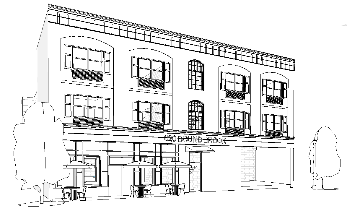first floor to be dark brick upper floors in re brick storefront should look like an old style pub show a car entering the garage on the lower right entry