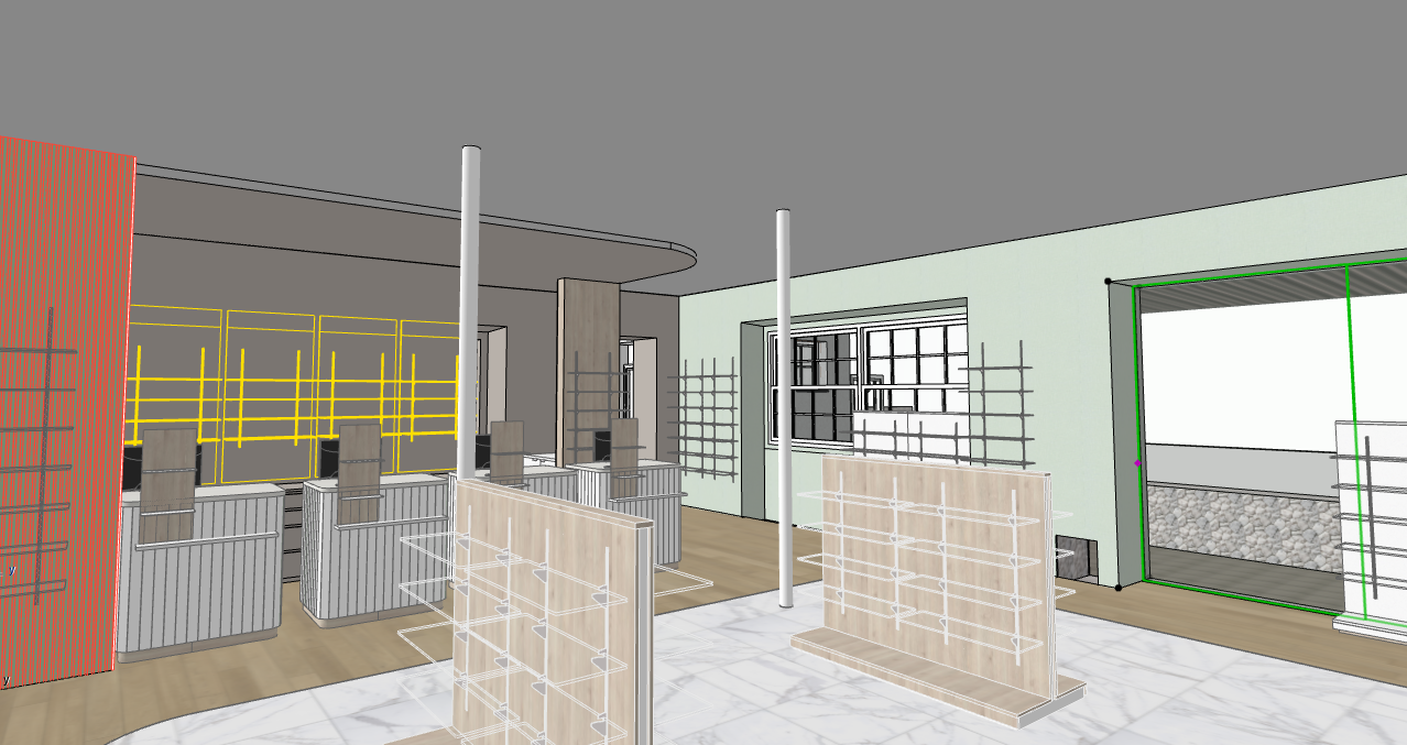 sustainable design exterior shot interior of a modern pharmacy with a natural atmosphere windows on the right warm and welcoming design featuring oak wood tones sea green accents and pebble grey details central display units in white and light wood combining clean minimalism with organic textures counters with a natural wood look flooring made of a mix of marble and oak wood creating a refined yet comfortable space soft artificial lighting suitable for a pharmacy complemented by gentle spring sunlight filtering through the windows high quality realistic rendering balanced composition focus on natural materials modern retail interior design product on selfs people inside architecture