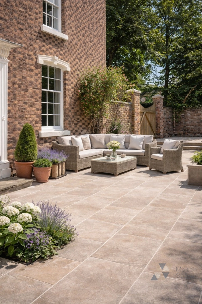 combine these photos to make a typical english garden with some flowers greenery patio with table and chairs with steps going down to a lawn