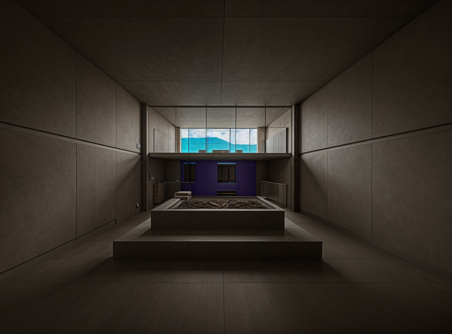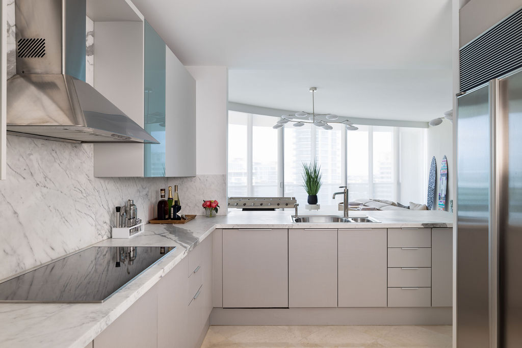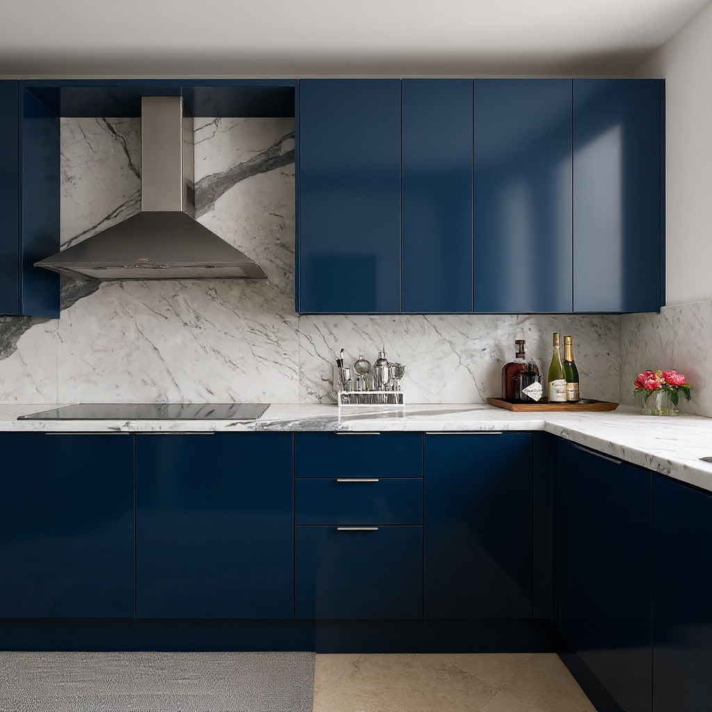 update the cabinetry to a high gloss navy blue and the floor to a high gloss white but keep the rug