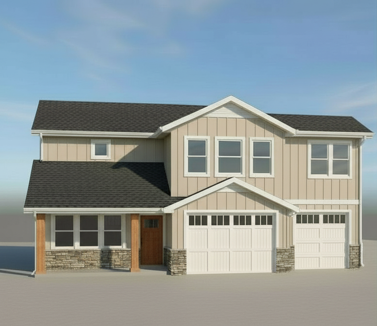 refine exterior landscaping and hardscape only keep house architecture identical modern southern california front yard with artificial turf lawn replace driveway with darker gray concrete pavers using a subtle alternating color blend pattern add white vinyl side yard gate on right side of house simple clean high end coastal residential curb appeal