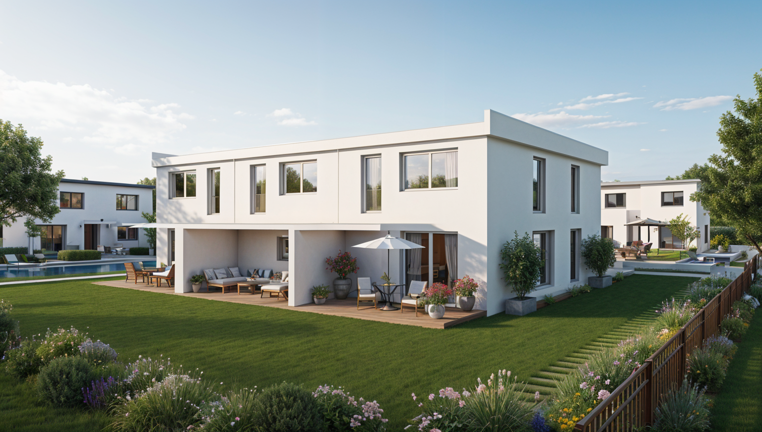 trojd m s vlastn mi terasami vykresli d l c plot mezi zahradami trojdomu vykresli atiku p st e ky jako sv tle ed vykresli st ny kter d l terasy jako sv tle ed dopl klemp sk prvky v barv antracit svody na pro ka dou st domu zvl svody pro 2 nejbli sti domu um sti vpravo u nejvzd len j sti vlevo