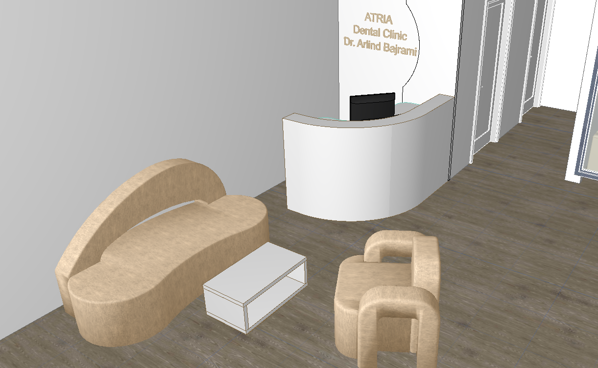 transform this archicad dental clinic waiting area into a highly realistic photorealistic render while strictly preserving the original layout furniture design dimensions reception desk placement and all architectural details do not redesign do not add new elements and do not change the composition keep everything exactly as modeled only enhance realism the sofas should remain beige with a soft elegant fabric appearance the reception desk behind them should remain glossy white clean modern and refined preserve all original forms lines material placement and furniture arrangement exactly as in the model use realistic pbr materials accurate reflections subtle surface imperfections soft shadows balanced global illumination and realistic natural daylight maintain clean edges correct proportions and all fine details from the original project the final result must look like a real photographed dental clinic waiting area not a cgi redesign not a concept variation and not a different project
