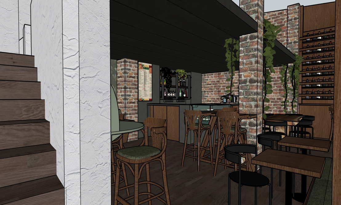 i want this interior to have a warm feeling have some vintage decorations and warm interior low lights above is a wood roof in sight