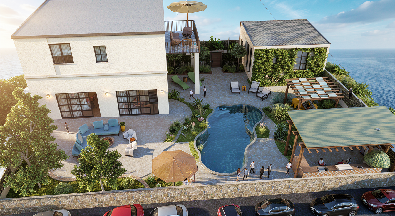 make this exterior look more realistic with landscaping and sconces make the siding less yellow but do not change the siding style or orientation