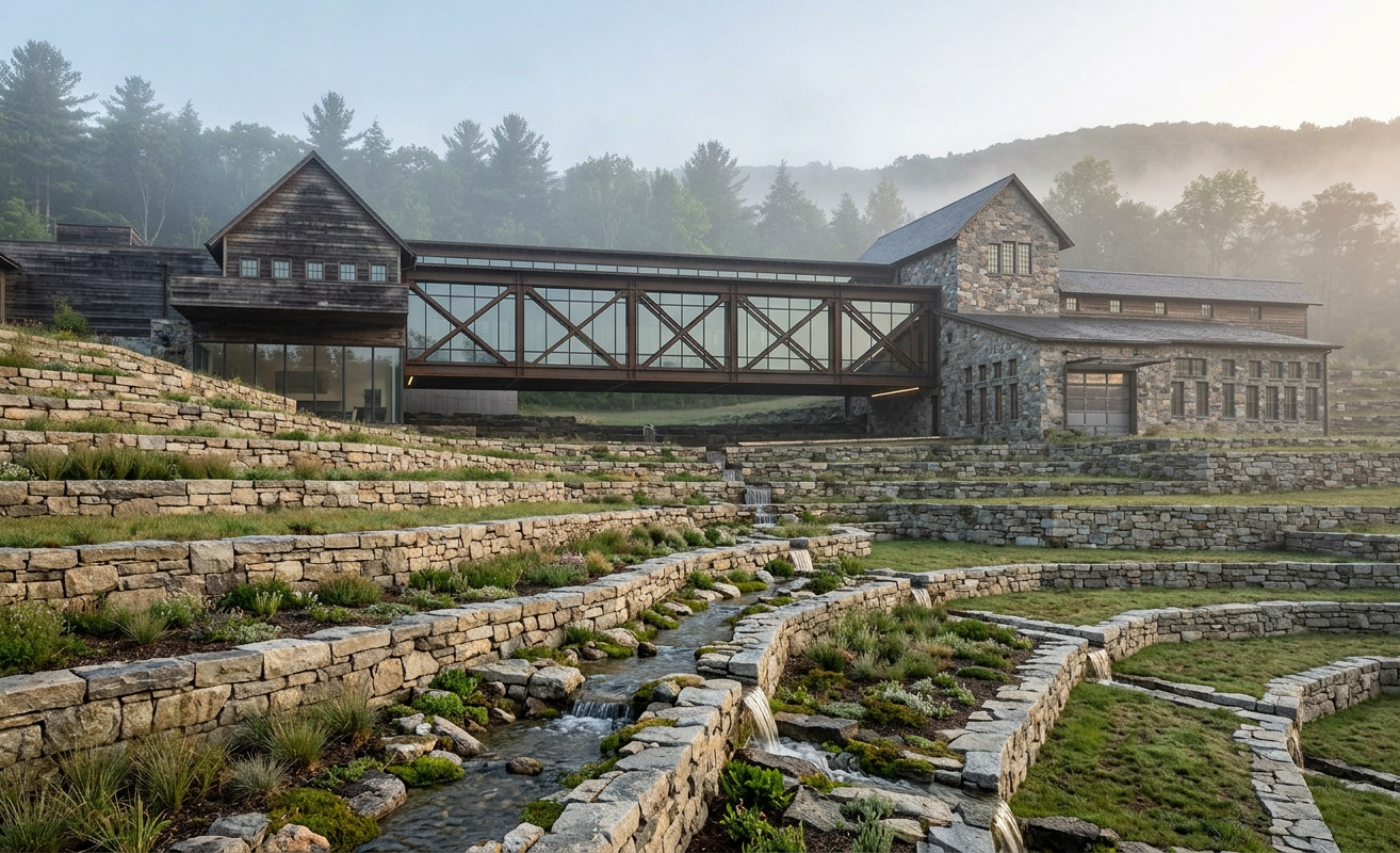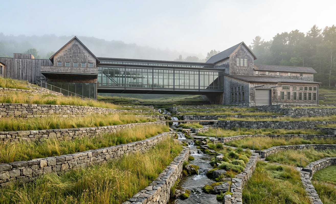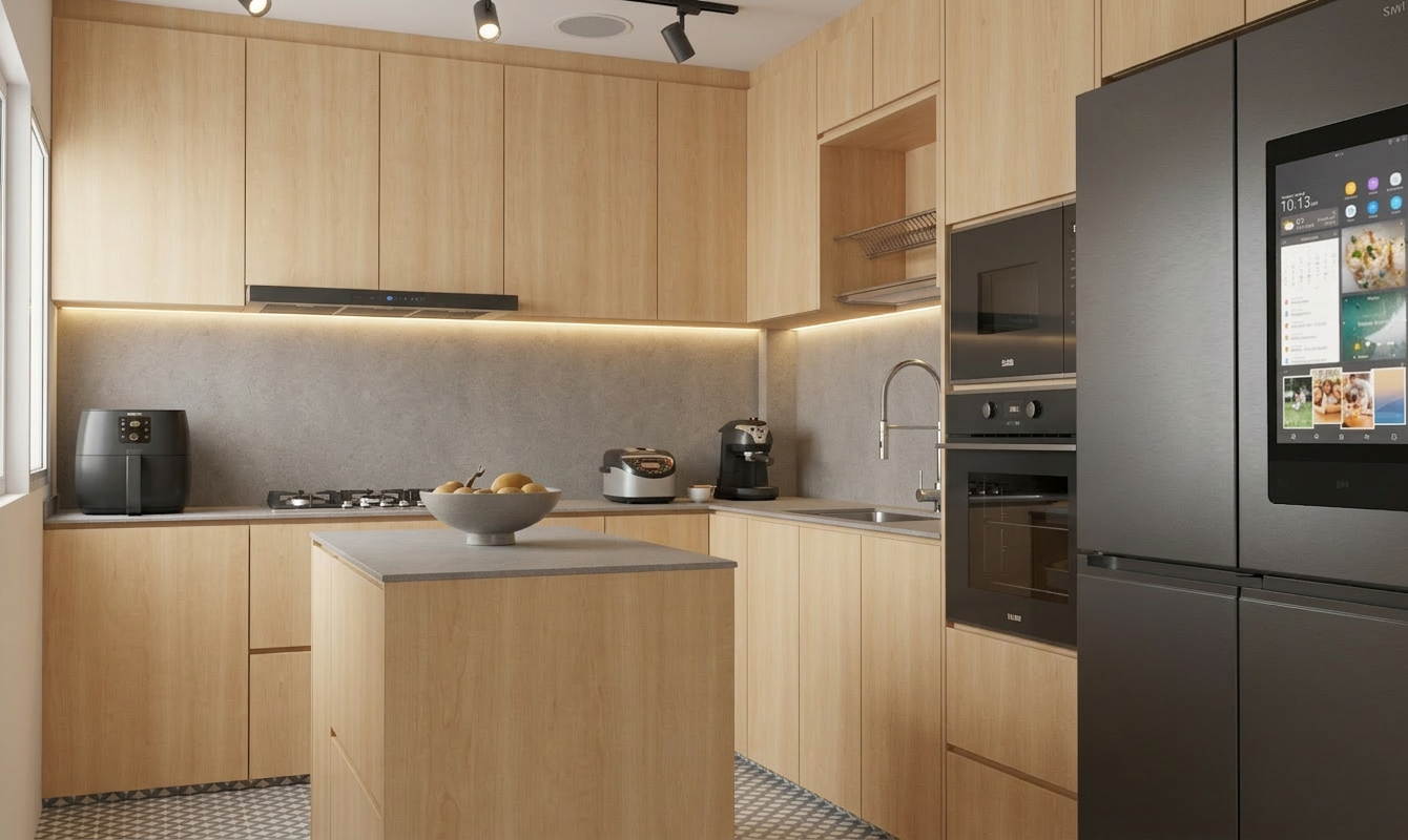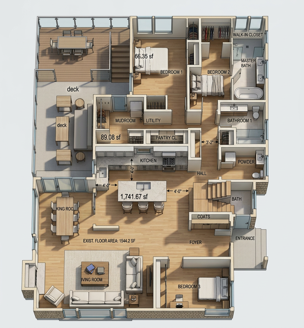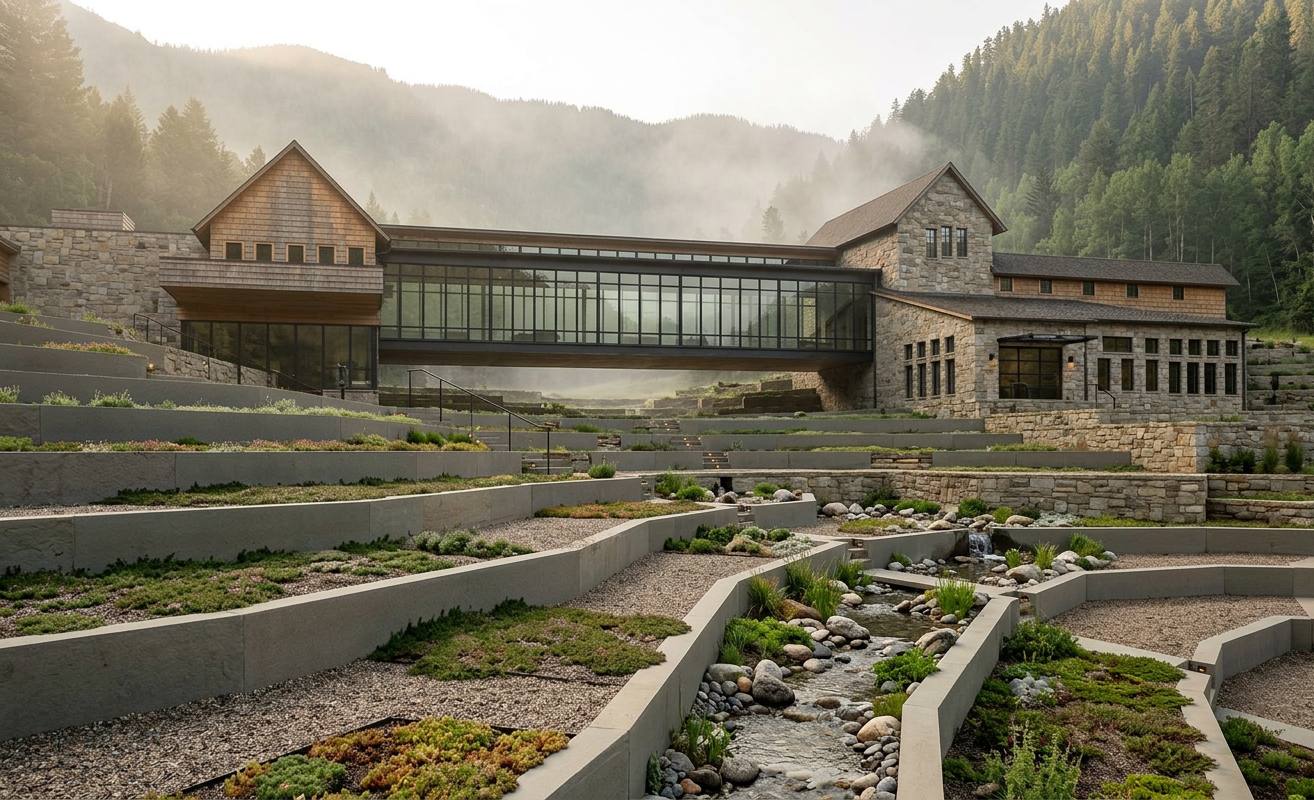 this is a large communal space in a community house with a large tv and gad fireplace with large shelving units on either side of the entertainment center filled with decorations and books the ceiling and floor should be in a walnut plank with the walnut planks going front to back golden hour lighting
