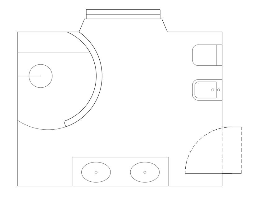 convert this floor plan into a realistic isometric 3d view of a bathroom show the space from an elevated angle with furniture walls and details visible a contemporary bathroom with travertine flooring and cladding rose gold taps the curved shower wall is made of glass blocks use the same furniture as shows on the plan do not change the orientation of the floorplan