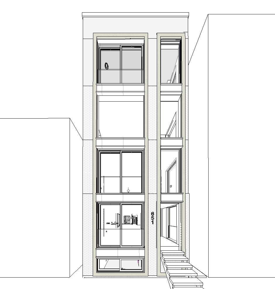 render this building metal window framing cream brick color at front add some green between buildings change horizontal floor mullion black metal use similar strategy as previous rendering