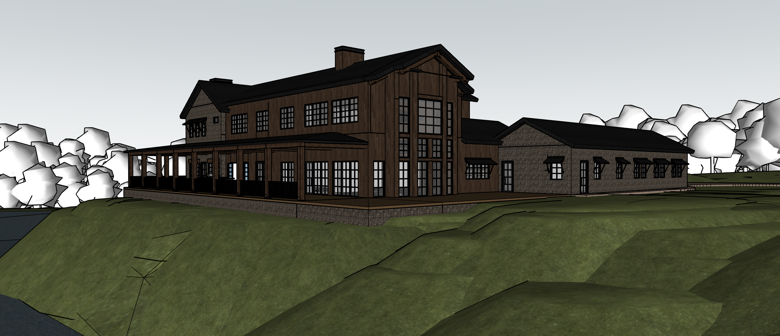 apply the material quality realism lighting and architectural visualization style from the reference image to the provided architectural model preserve the exact massing rooflines window locations proportions and architectural geometry of the model exterior materials remain unchanged reclaimed weathered vertical wood siding in warm brown tones with natural variation authentic moss rock stone veneer at lower walls and base conditions matte black standing seam metal roofing and black aluminum window frames with realistic glass reflections emphasize the building s relationship to a subtle engineered grade change that gently slopes down toward a pond below the terrain should read as controlled site grading rather than a dramatic cliff maintain a clean defined edge at the lawn where the grade begins to fall but avoid steep rock faces or vertical drops the pond should sit slightly below the finished floor elevation with calm water and soft natural reflections the transition between lawn and slope should feel intentional and minimal with restrained planting and no exaggerated erosion or rugged terrain add realistic depth through accurate material thickness window reveals shadowing and construction detail without altering the design lighting natural daylight soft late afternoon sun neutral sky realistic shadows ultra photoreal architectural rendering with high material fidelity no stylization or exaggeration camera positioned at eye level with a slight downward angle along the length of the building to express the pond side condition avoiding dramatic or cinematic cliff perspectives