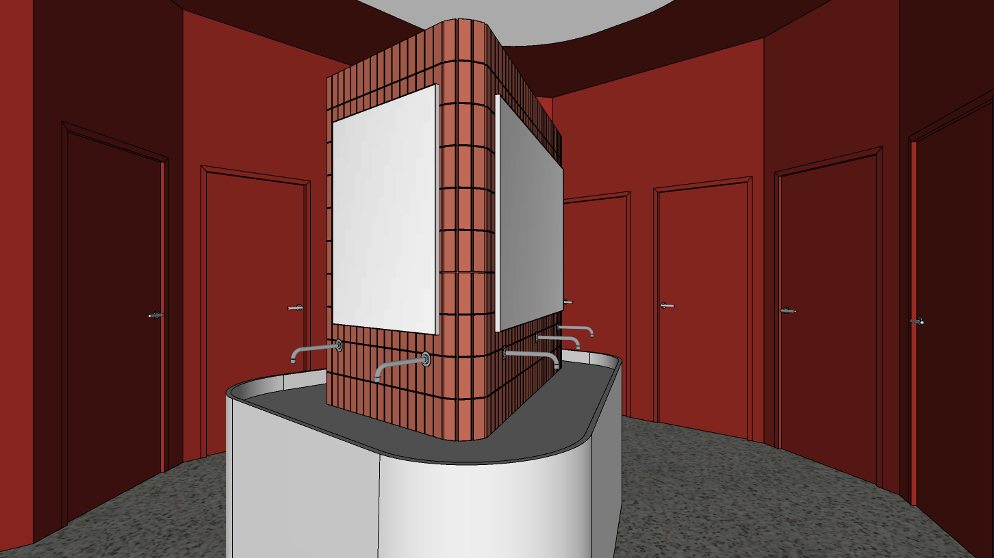 realistic render restrooms at a gas station in iceland a person standing at the bassin the white squares are mirrors the bassin is in brushed stainless steel