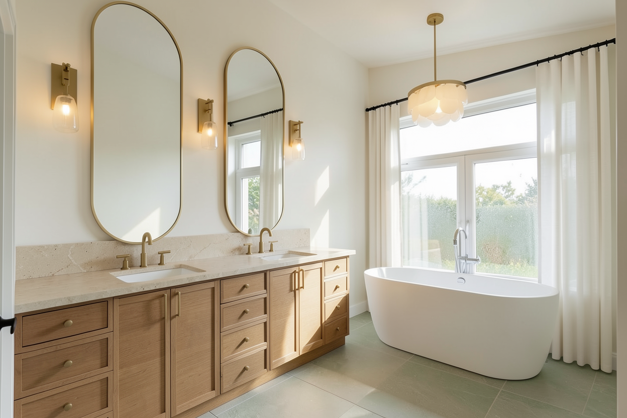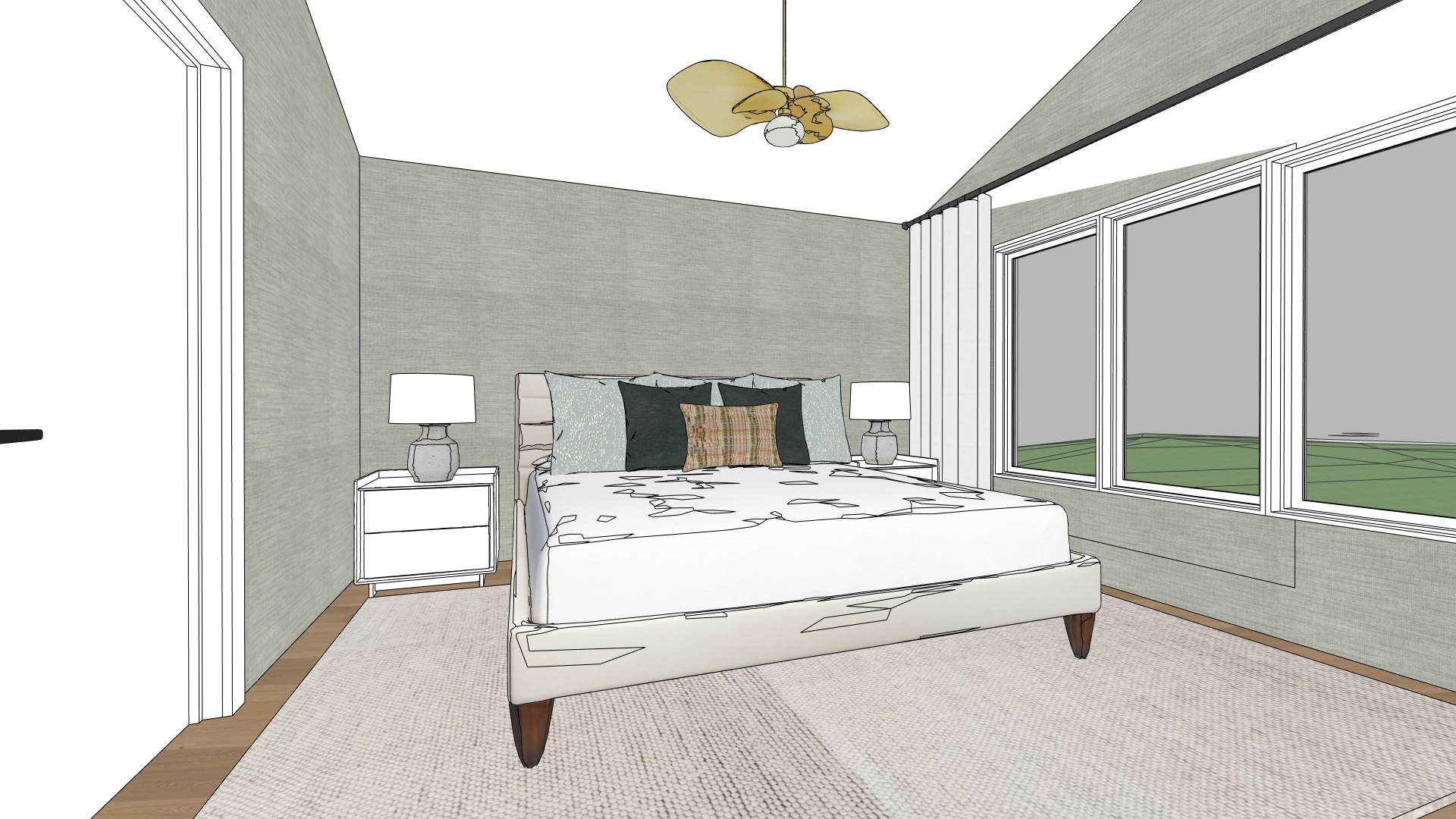 photorealistic interior rendering of a calm elegant primary bedroom daylight scene upholstered bed with a softly padded headboard in light beige fabric subtle texture clean modern lines bed frame upholstered to match slightly elevated with tapered dark wood legs crisp white bedding with natural folds and realistic fabric creasing layered pillows large light neutral pillows at the back darker muted green accent pillows and a small lumbar pillow with a subtle plaid pattern in warm earthy tones two matching white nightstands with simple modern design flat drawer fronts minimal hardware placed symmetrically on each side of the bed table lamps on each nightstand with ceramic textured bases in soft off white and white fabric drum shades emitting warm ambient light walls covered in soft sage green textured wallpaper or fabric wall covering matte finish creating a serene and cozy atmosphere ceiling painted clean white large area rug under the bed in a light neutral tone subtle woven texture extending beyond the sides and foot of the bed natural light oak or light wood flooring visible at the perimeter of the room large windows on the right side of the room with white trim dressed with full height off white sheer curtains mounted on a discreet ceiling track gently diffusing natural daylight exterior view softly blurred with greenery visible overcast daylight ceiling light fixture centered above the bed sculptural brass pendant with organic petal shaped elements and a central frosted glass globe soft warm glow balanced natural daylight mixed with warm interior lighting soft shadows realistic reflections true to life materials calm refined modern organic aesthetic ultra realistic rendering global illumination physically accurate materials high dynamic range architectural photography style eye level camera angle wide angle lens 24 28mm sharp focus natural color grading 8k quality