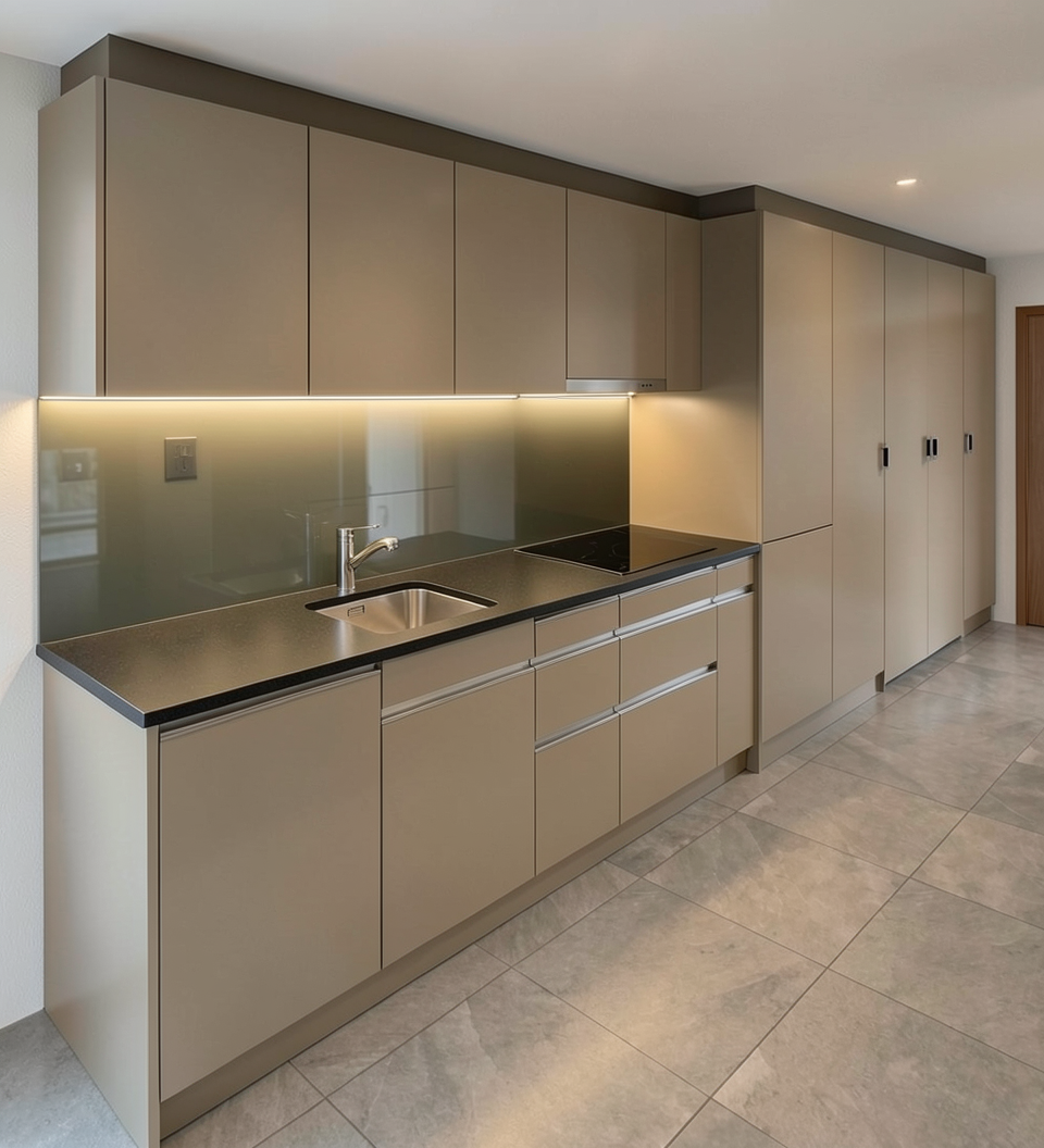 die ncs farbe der m bel ist ncs s1502 y20r die k chenr ckwand ist aus glas und die ncs farbe ist s 2020 g40y die einteilung der griffleisten soll genau so bernommen werden nur realistischer dargestellt waschbecken und armatur sind edelstahl gl zend sie armatur soll die form wie auf dem bild behalten das kochfeld ist fl chenb ndig eingebaut die k chenabdeckung ist ein granit der schwarz matt und geb rstet ist die oberfl che vom granit ist nur schwarz ohne punkte drauf die beleuchtung der k che ist mit einem led band