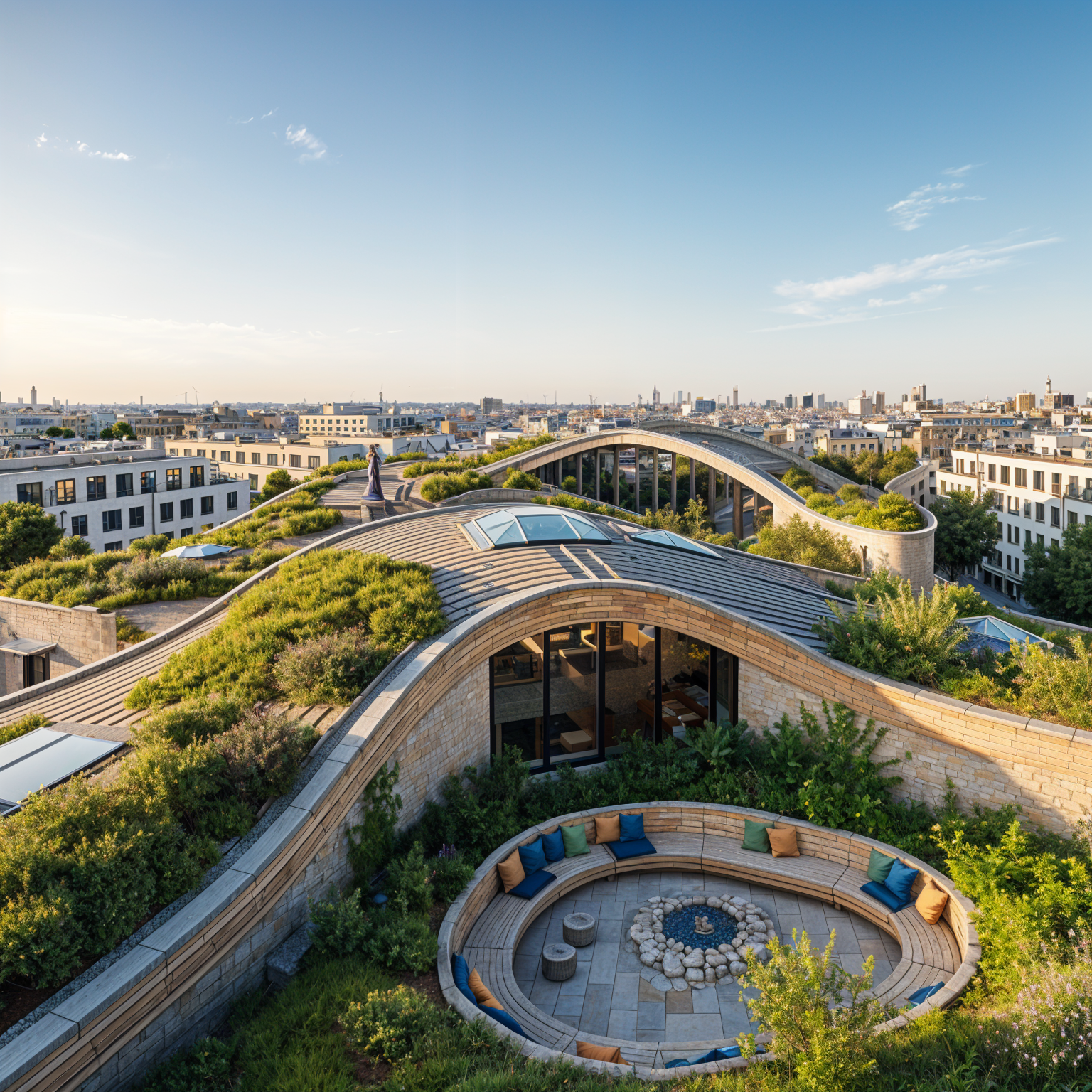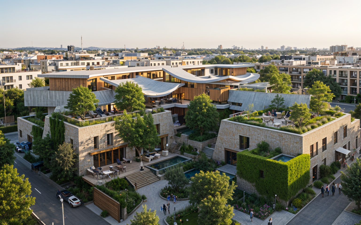 new urbanism perspective shot use nature material wood stone concrete coziness and greenery set in the evening with soft gentle sunlight make it a community center make roofs curvy concave architecture